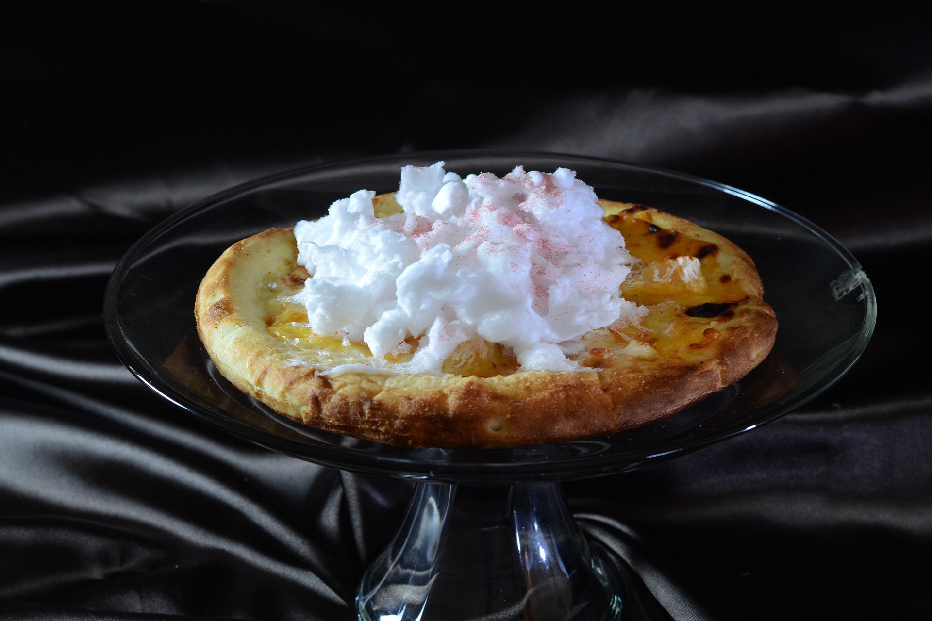 もくもくの雲が乗った不思議な見た目のチーズピザが登場。雲の正体は綿あめ。シュワシュワと溶けた後はパリパリ食感の飴状に。チーズの塩気と砂糖の甘さがピッタリの一品です。