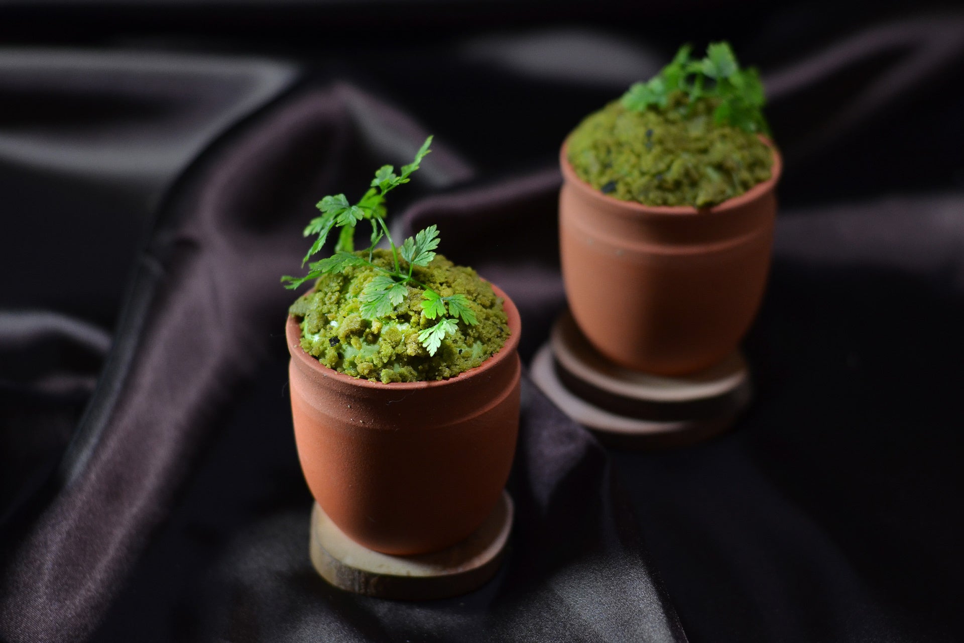 まるで苔?な陶器に入った抹茶の和風ケーキ。