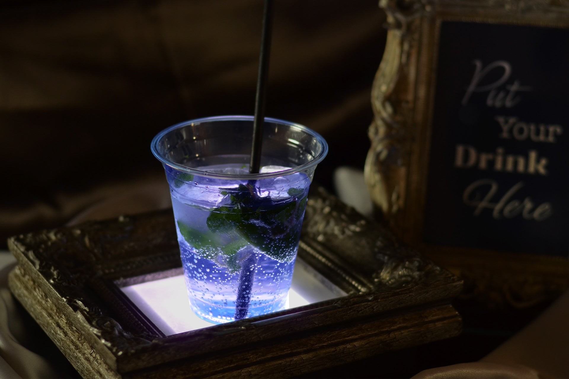 ハーブとライム香る透明のモヒート風ドリンクを店内の特別なスポットに置くと…。青く光るドリンクに大変身。