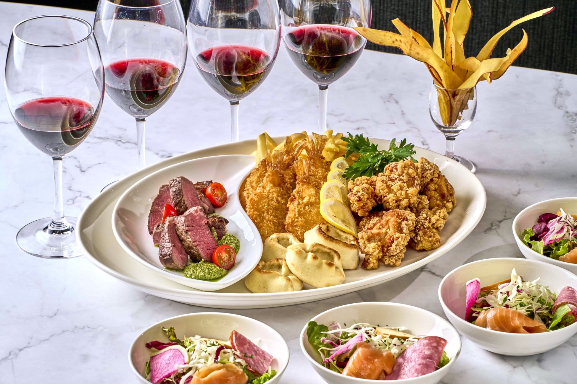 サラダ・鶏の唐揚げ・ピッコリピザ・海老のフリット・牛肉のステーキ・ポテトフライ