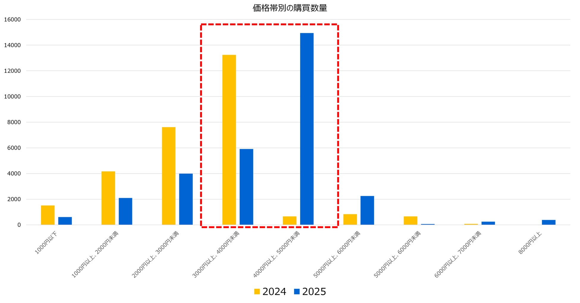 2024年の同時期と比較して、銘柄米・ブレンド米・備蓄米全体での平均購入単価が上昇。最も購入が多かったのは4,000円以上5,000円未満で、前年より1,000円高い水準となりました。