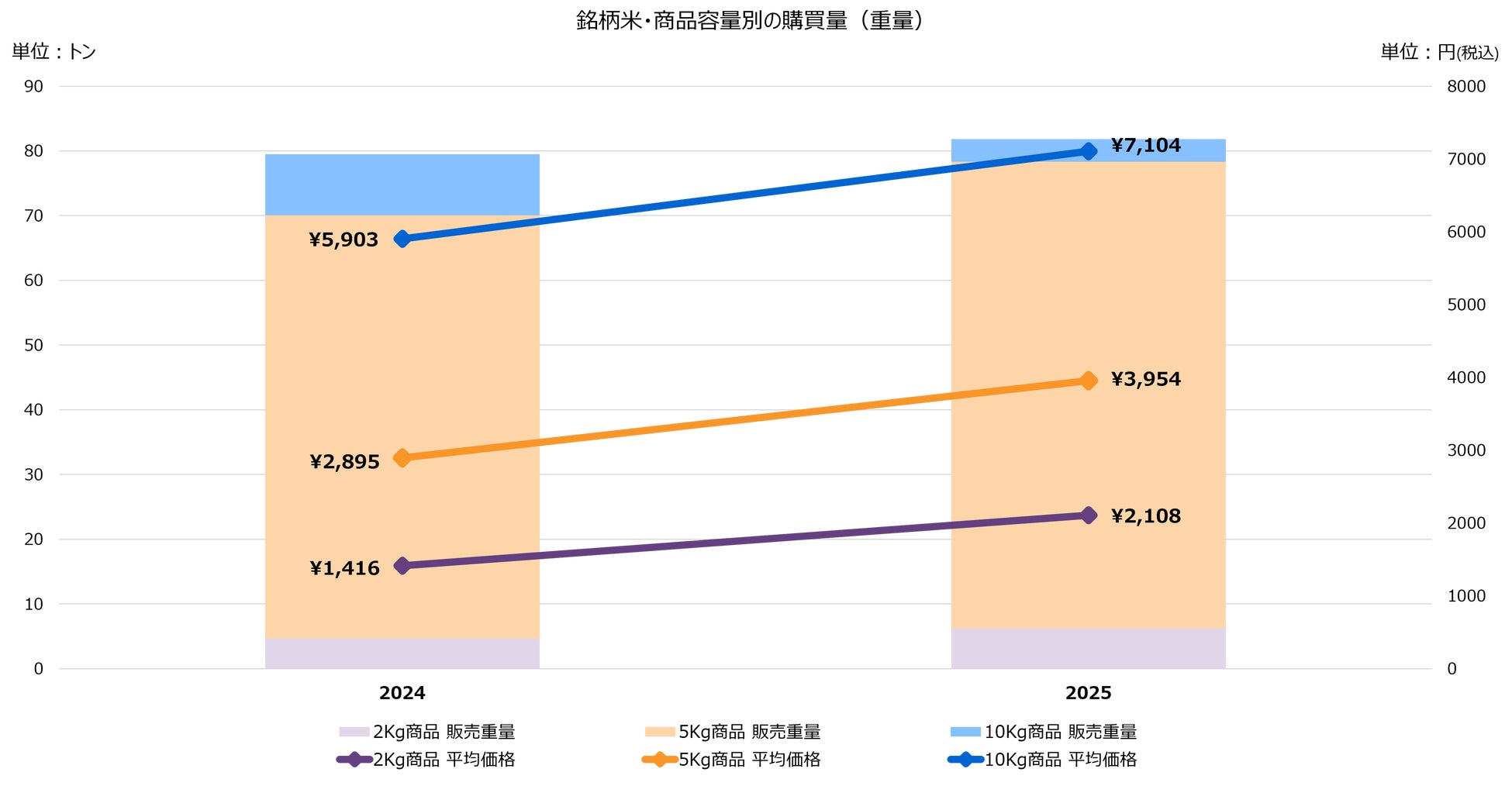銘柄米の平均価格は全体で上昇傾向。2kg・5kgの商品が、10kgの販売重量減少を補う形となりました。