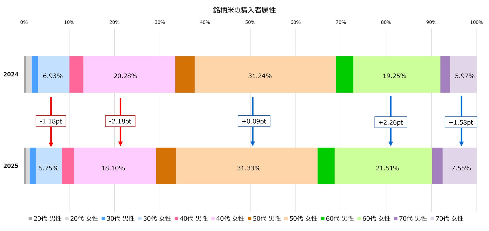 銘柄米における購買は、50代以上の購入が増加の一方で40代以下は減少傾向となりました。