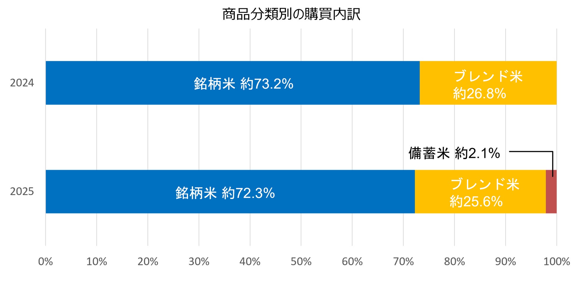 こうした容量選択の変化が進む中でも、銘柄米・ブレンド米・備蓄米における米の購入全体では約72.3%が「銘柄米」を継続購入しており、物価上昇が続く中でも依然として根強い支持があることが分かりました。一方で「備蓄米」の購入は約2.1%にとどまり、日常的な選択肢としては限定的な位置づけとなりました。