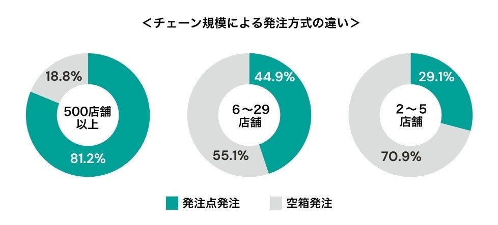 近年、医薬品の供給不足が深刻化する一方で、不動在庫や廃棄の問題も根深く存在しており、薬局経営における適正在庫の実現が大きな課題となっています。適正在庫の実現のためには、予備の箱を開封したら(=空箱が出たら)発注を行う空箱発注よりも、医薬品ごとに定めた残数になった時点で発注を行う発注点発注が良いとされています。ところが、薬剤師を対象にウィーメックスが実施したアンケートによると、500店舗以上のチェーン薬局では約8割が発注点発注を実施できているのに対し、チェーンの規模が小さいほど空箱発注の割合が多いことが判明しました(*1)。