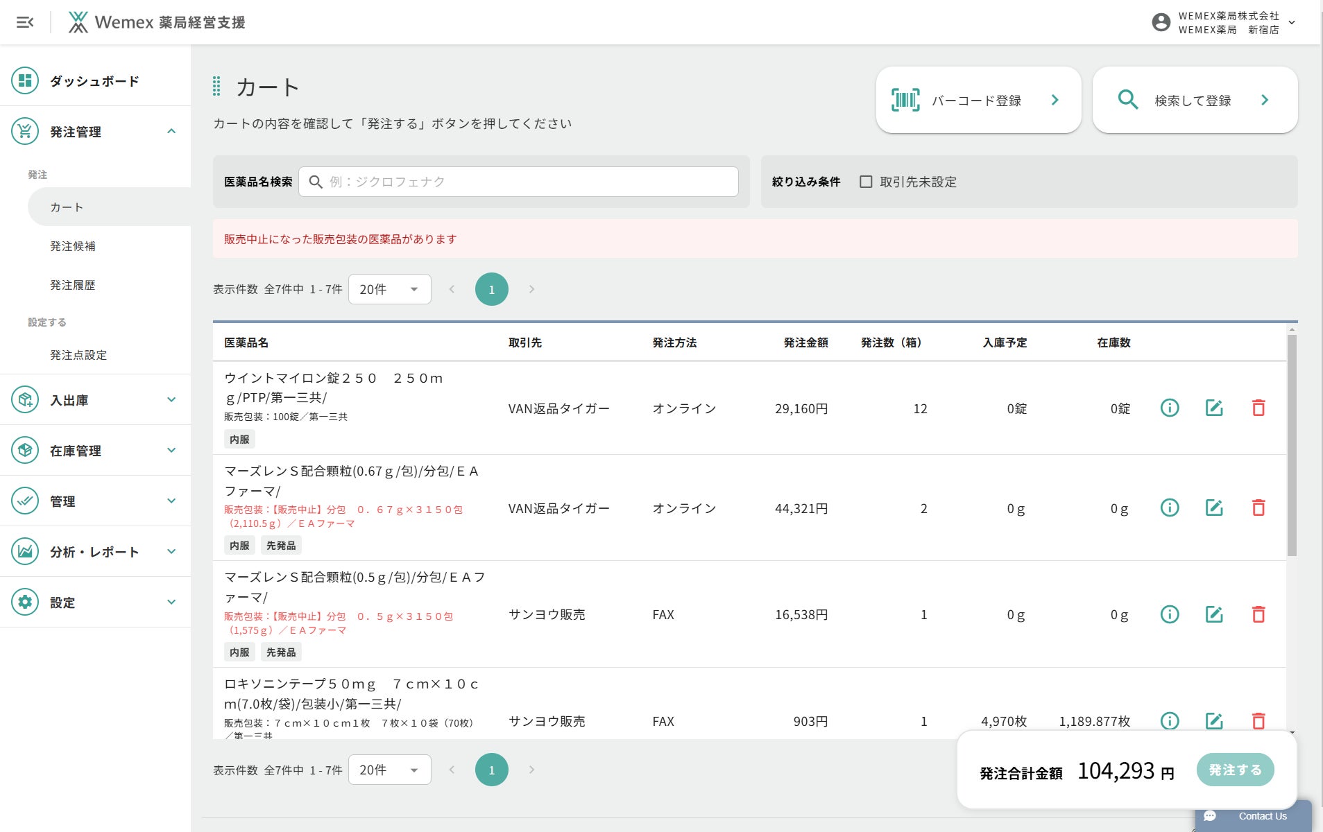 このような状況下において「Wemex 薬局経営支援」は、医薬品ごとの在庫管理や発注業務、店舗間での在庫融通を簡便化し、薬剤師の発注業務の効率化と対人業務へのタスクシフト、適正在庫の維持を通じた経営の安定化を支援します。