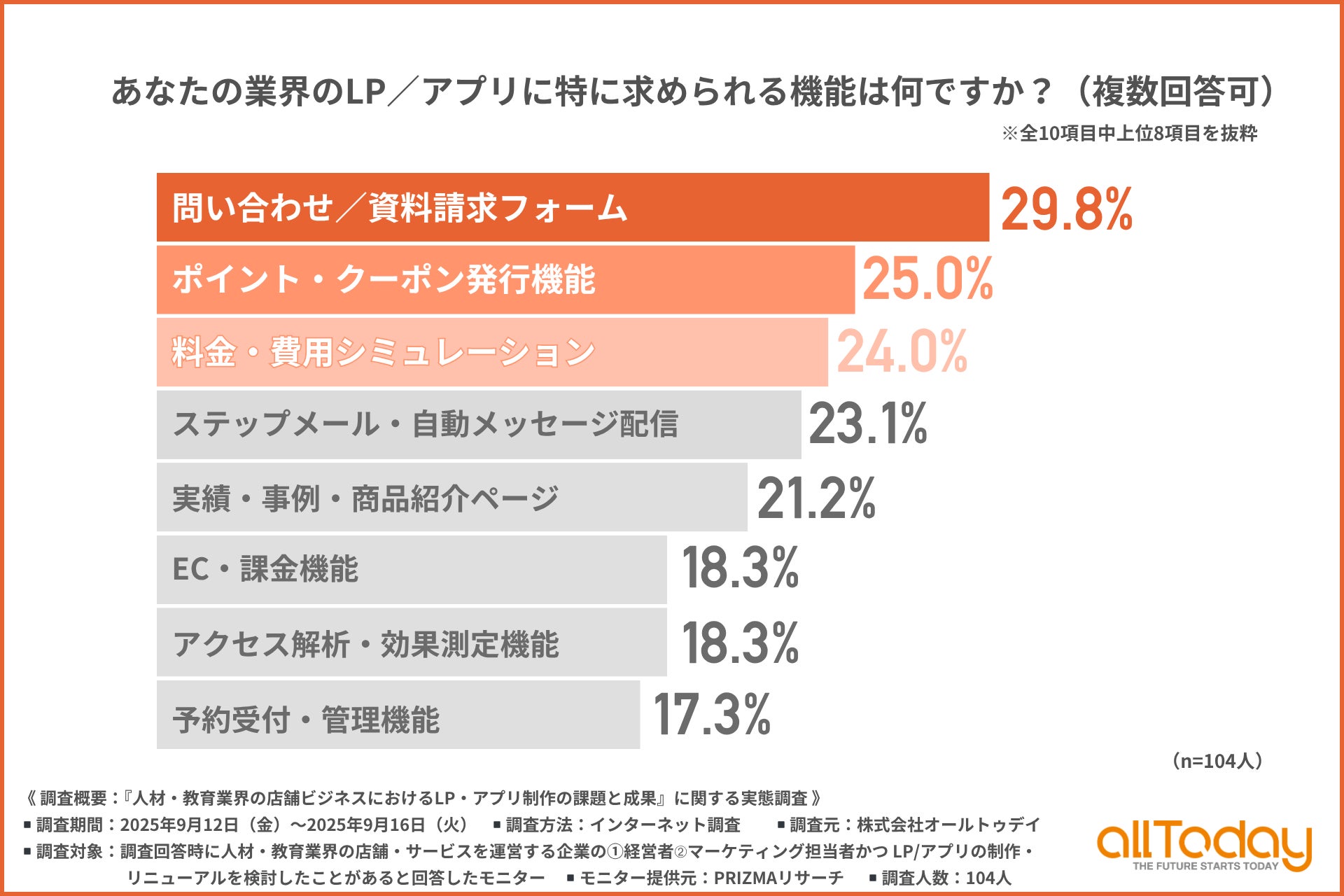 「あなたの業界のLP/アプリに特に求められる機能」について尋ねたところ、『問い合わせ/資料請求フォーム(29.8%)』が最も多く、『ポイント・クーポン発行機能(25.0%)』『料金・費用シミュレーション(24.0%)』と続きました。
