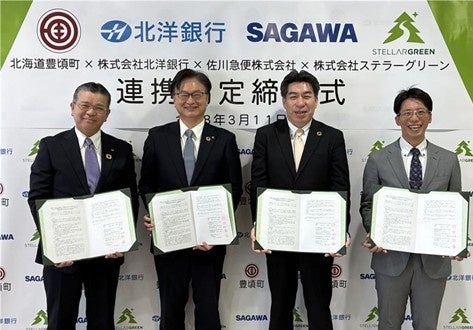 森林カーボンクレジット創出の支援事業を展開する株式会社ステラーグリーン(本社:東京都中央区、代表取締役社長 兼 CEO:中村 彰徳、以下「ステラーグリーン」)と株式会社北洋銀行(本店:北海道札幌市、取締役頭取:津山 博恒、以下「北洋銀行」)、SGホールディングスグループの佐川急便株式会社(本社:京都府京都市南区、代表取締役社長:笹森 公彰、以下「佐川急便」)は、2026年3月11日(水)に、北海道豊頃町(町長:按田 武、以下「豊頃町」)における、森林資源の活用によるカーボンニュートラルの実現および持続可能な社会の実現に向けた連携協定を締結しました。