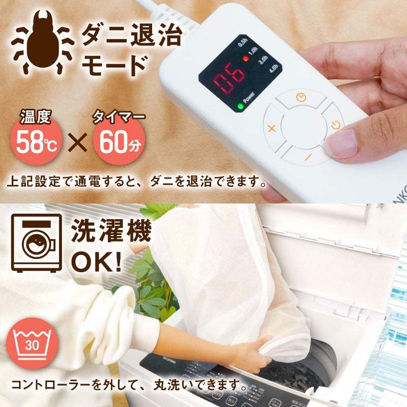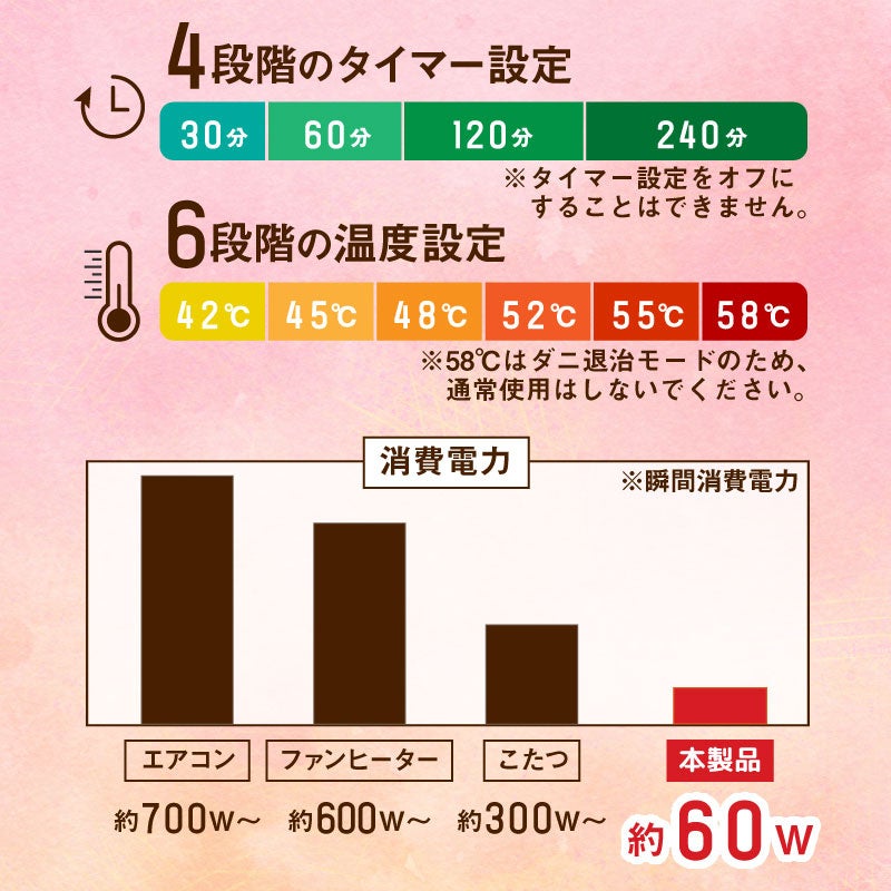長さ90cm幅43cm厚さ1cm。温度設定は42度~55度とダニ退治モード(58度)の6段階の切り替えが可能。30分~240分までの4段階のタイマー設定が可能。操作はリモコンで手元で切り替えが可能です。消費電力は約60Wなので省エネでお得にお使いいただけます。汚れたらコントローラー部(リモコン+ケーブル)を取り外して洗濯機で丸洗いが可能、いつでも清潔にお使いいただけます。