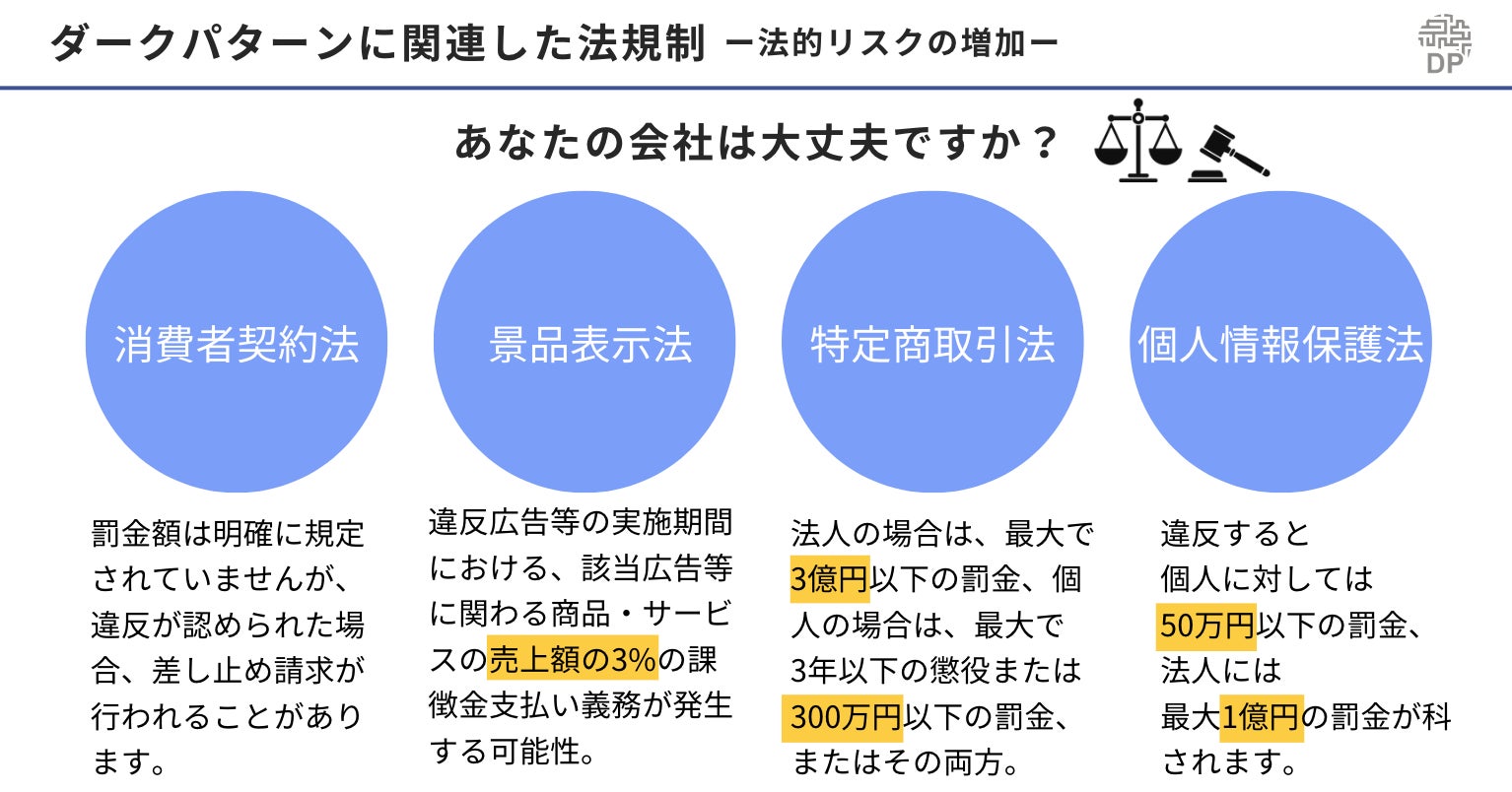 こうしたデザインの広がりに伴い、国際的な規制が強化されつつあります。日本では現在ディセプティブパターン(ダークパターン)に対する法規制はないものの、消費者契約法や景品表示法など関連した法規制があり、企業は対策が求められています。