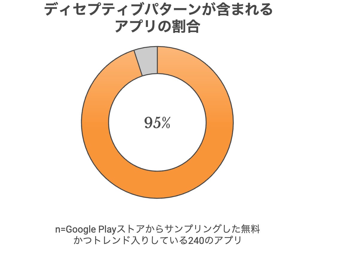 チューリッヒ大学による2019年の調査では、Google Playストアからサンプリングした無料かつトレンド入りしている240のアプリのうち、95%にディセプティブパターンが含まれていることが発覚しました。