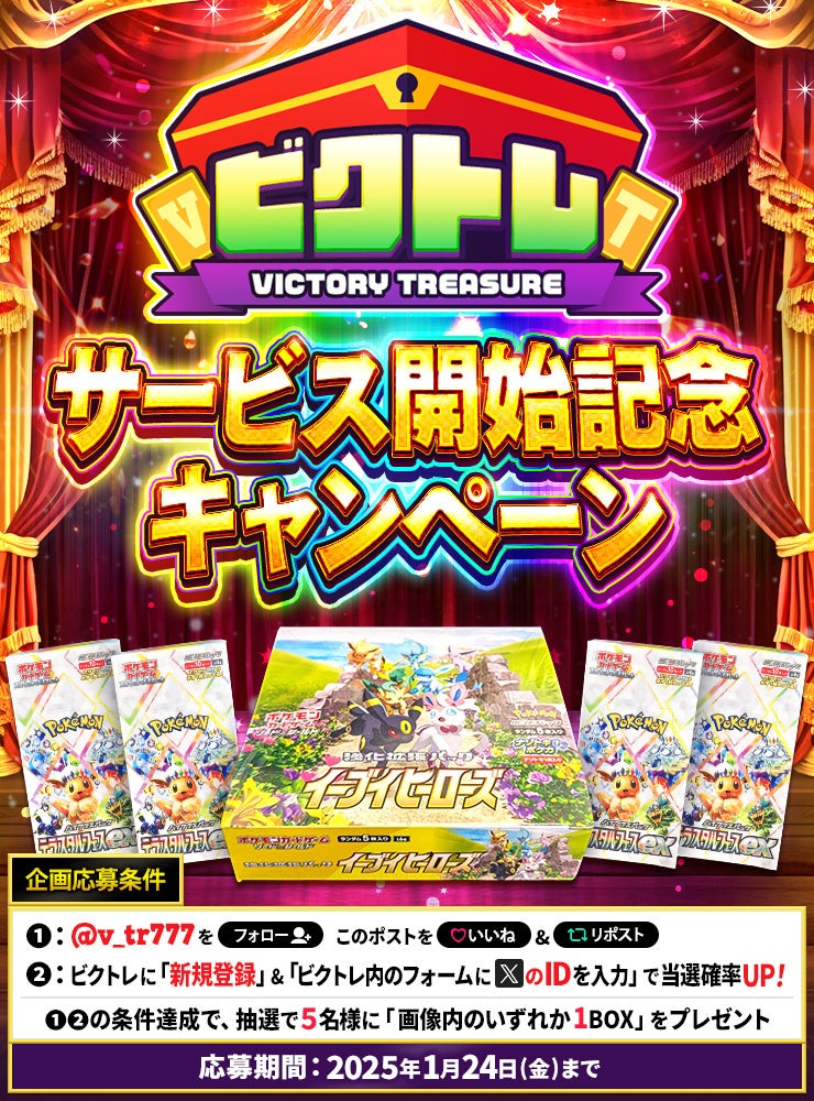ビクトレの公式Xアカウントをフォロー&リポストすることで、抽選で5名様の方に「強化拡張パック イーブイヒーローズ」や「ハイクラスパック テラスタルフェスex」が当たります。
