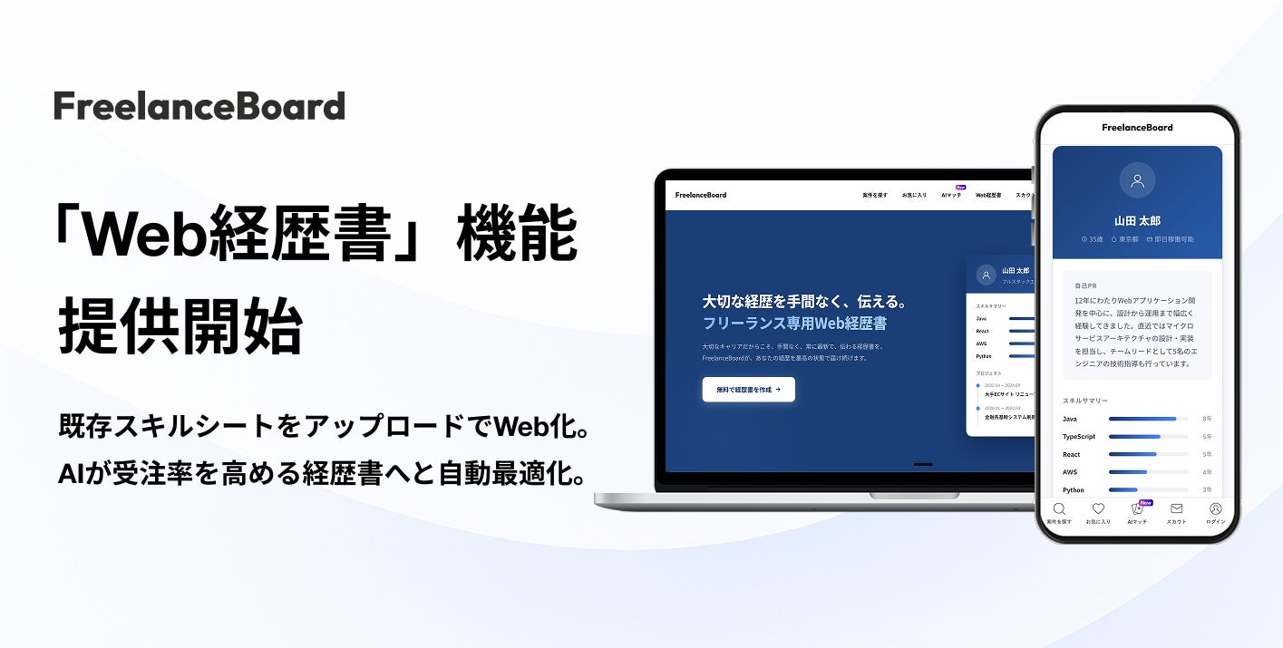 フリーランスエンジニア・ITフリーランス向け案件検索サイト「フリーランスボード(https://freelance-board.com)」を運営するINSTANTROOM株式会社(本社:東京都渋谷区、代表取締役:曽根弘介)は、フリーランスの案件獲得力を高める新機能『Web経歴書』を2026年4月20日に正式リリースしたことをお知らせいたします。