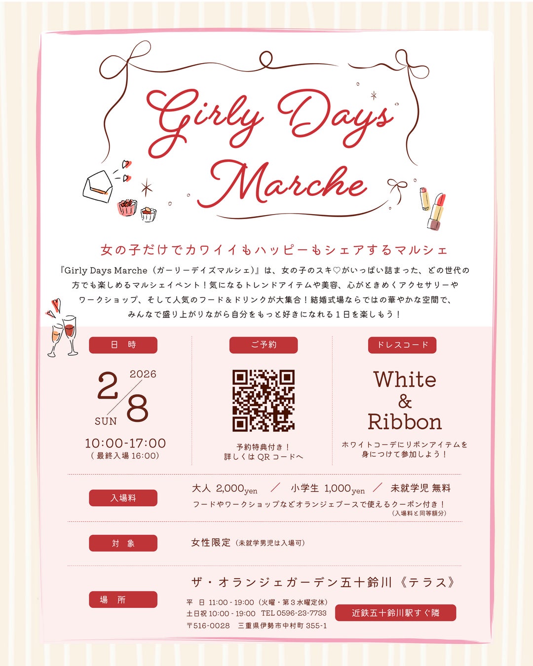 IXホールディングス株式会社(本社:三重県伊勢市)のグループ会社である、オランジェ株式会社(本社:三重県伊勢市、代表取締役社長 小河満美子)は、2026年2月8日にザ・オランジェガーデン五十鈴川にて、女性限定マルシェイベント「Girly Days Marche ~ ガーリー デイズ マルシェ」を伊勢で開催します。本イベントは、アクセサリーや雑貨、美容体験、スイーツづくりなど、“かわいい”と“楽しい”を女の子同士で分かち合える、結婚式場ならではの特別な空間で楽しむ1日限定のマルシェイベントです。