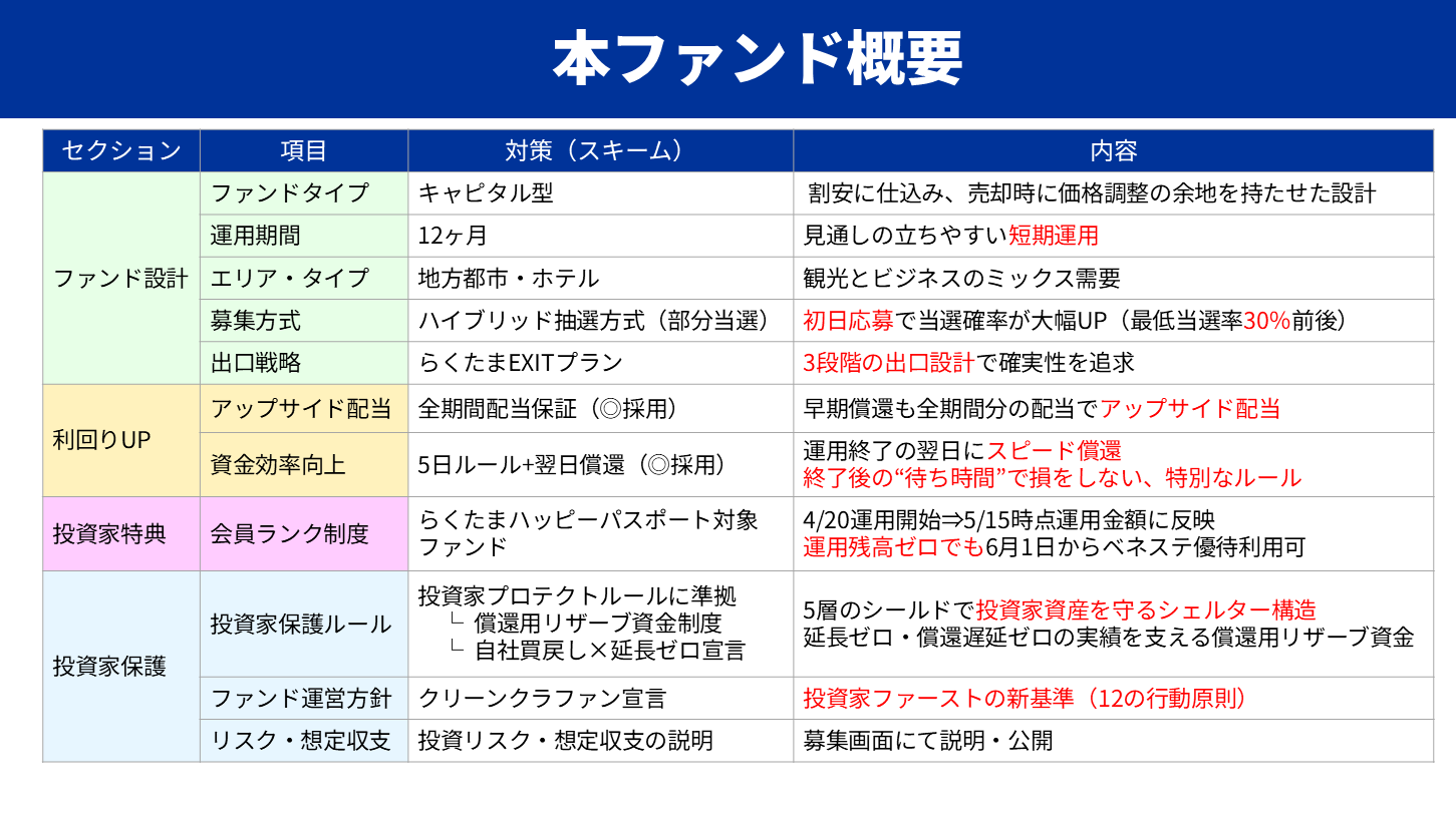 『らくたま』は、不動産クラウドファンディングをより安心で身近な資産形成の手段としてお届けするために誕生しました。私たちは安全性と透明性を常に重視し、堅実なファンド設計と多彩な特典プログラムを通じて、従来の「投資=堅い・難しい」という固定観念を取り払い、誰もが1万円から参加できる新しい投資体験を提供してまいります。