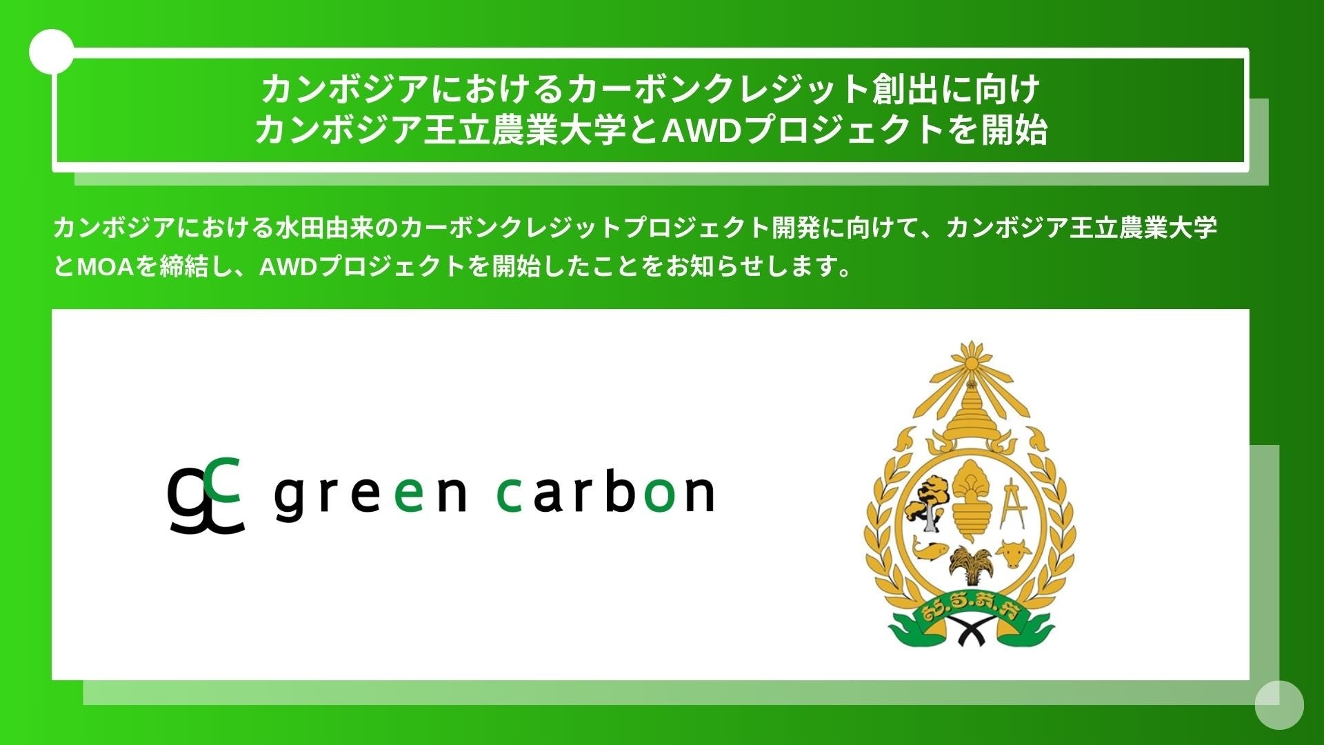 Green Carbon株式会社(代表取締役:大北潤、以下Green Carbon(読み:グリーンカーボン))はこの度、カンボジアにおける水田由来のカーボンクレジットプロジェクト(以下、本プロジェクト)開発に向けて、カンボジア王立農業大学(Royal University of Agriculture、以下RUA)とMOAを締結し、カンボジア北西部のBattambangエリアでAWDプロジェクトを10月から開始したことをお知らせします。カンボジアにおいて、並行して進めているバイオ炭プロジェクトを活用し、AWD(間断灌漑※1)及びバイオ炭双方の事業拡大を進めることで、カンボジアの経済発展に寄与することを目指します。