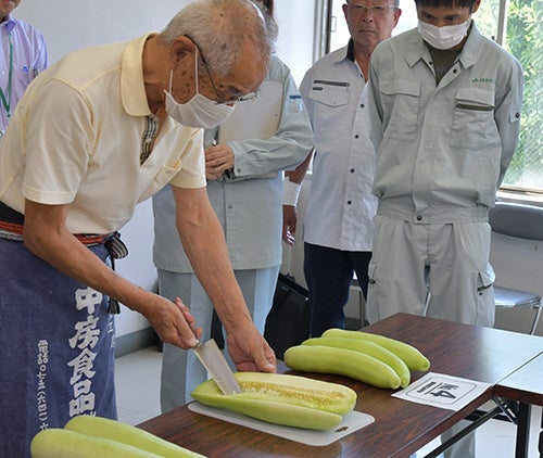 シロウリの品評会は、同市農林業祭実行委員会が主催。出荷が最盛期を迎える7月中旬ごろに開催されます。この日は、栽培農家からよりすぐりのシロウリ6点が出品。表面の凹凸、色、つやなどの見た目による1次審査で3点に絞られた後、半分に切られ肉厚さなど中身を審査する2次審査を経て優秀賞には平田春生さん(同市浦堂本町)が選ばれました。審査員の大阪府北部農と緑の総合事務所農の普及課藤川さんは「急な気温上昇やゲリラ豪雨で栽培が難しいなか素晴らしいシロウリを出品していただいた。今後も地元の名産シロウリを生産者の皆さまでPRしてほしい」と講評していました。