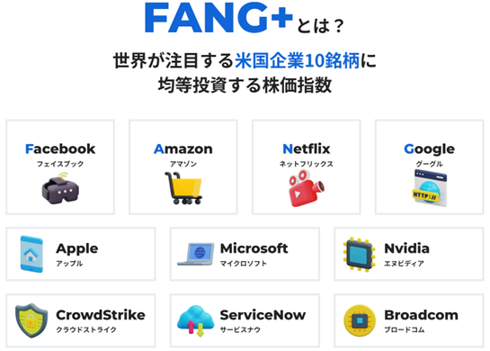 「FANG+(ファングプラス)」は、Facebook、Amazon、Netflix、Googleの4社を含む、米国企業10銘柄で構成された株価指数です。次世代テクノロジーをベースに、グローバルな現代社会において人々の生活に大きな影響力を持ち、高い知名度を有する企業が集結しています。