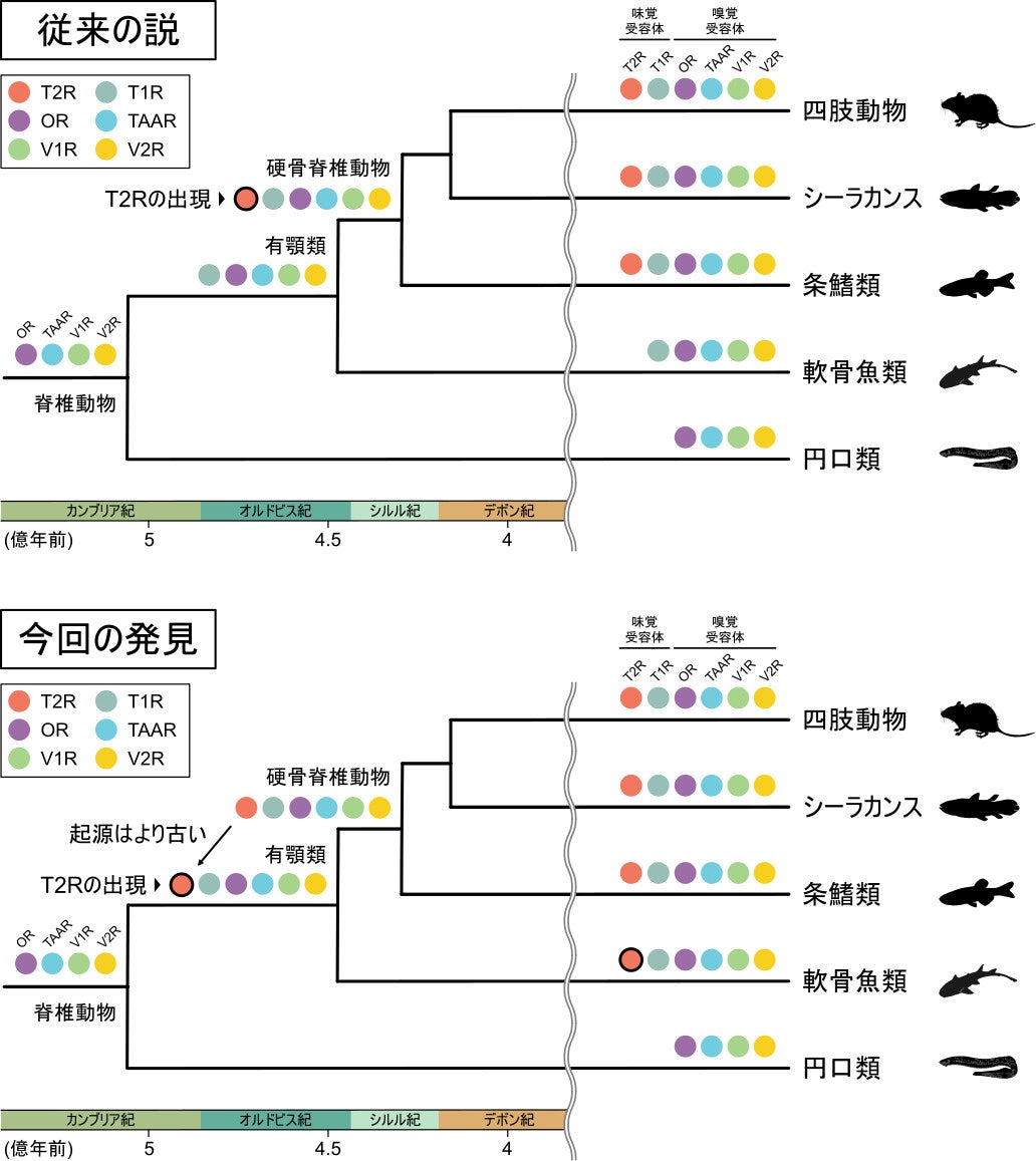 苦味感覚は、主に有害物質の摂取を回避する機能を持ち、動物の生存に重要な役割を果たします。脊椎動物では、苦味はGタンパク質共役型受容体(GPCR)(注3)の一種であるT2Rによって検知されます。脊椎動物は、T2Rを含めて6種類のGPCR型化学感覚受容体(注4)を持っており、その内訳は、2種類の味覚受容体(T1RとT2R)と4種類の嗅覚受容体(OR, TAAR, V1R, V2R)です。これらの受容体のうち、T2Rを除く5種類の受容体は有顎類に広く見られますが、T2Rだけはこれまで硬骨脊椎動物(注5)でのみ見つかっていました。そのため、T2Rの起源は他の化学感覚受容体よりも遅く、硬骨脊椎動物の共通祖先にあると考えられてきました。しかし、脊椎動物の進化過程で、条鰭類(注6)よりも早期に分岐した軟骨魚類や円口類(注7)に本当にT2Rが存在しないのかは、これまでゲノム情報の集積が不十分であったため、十分な調査がなされていませんでした。