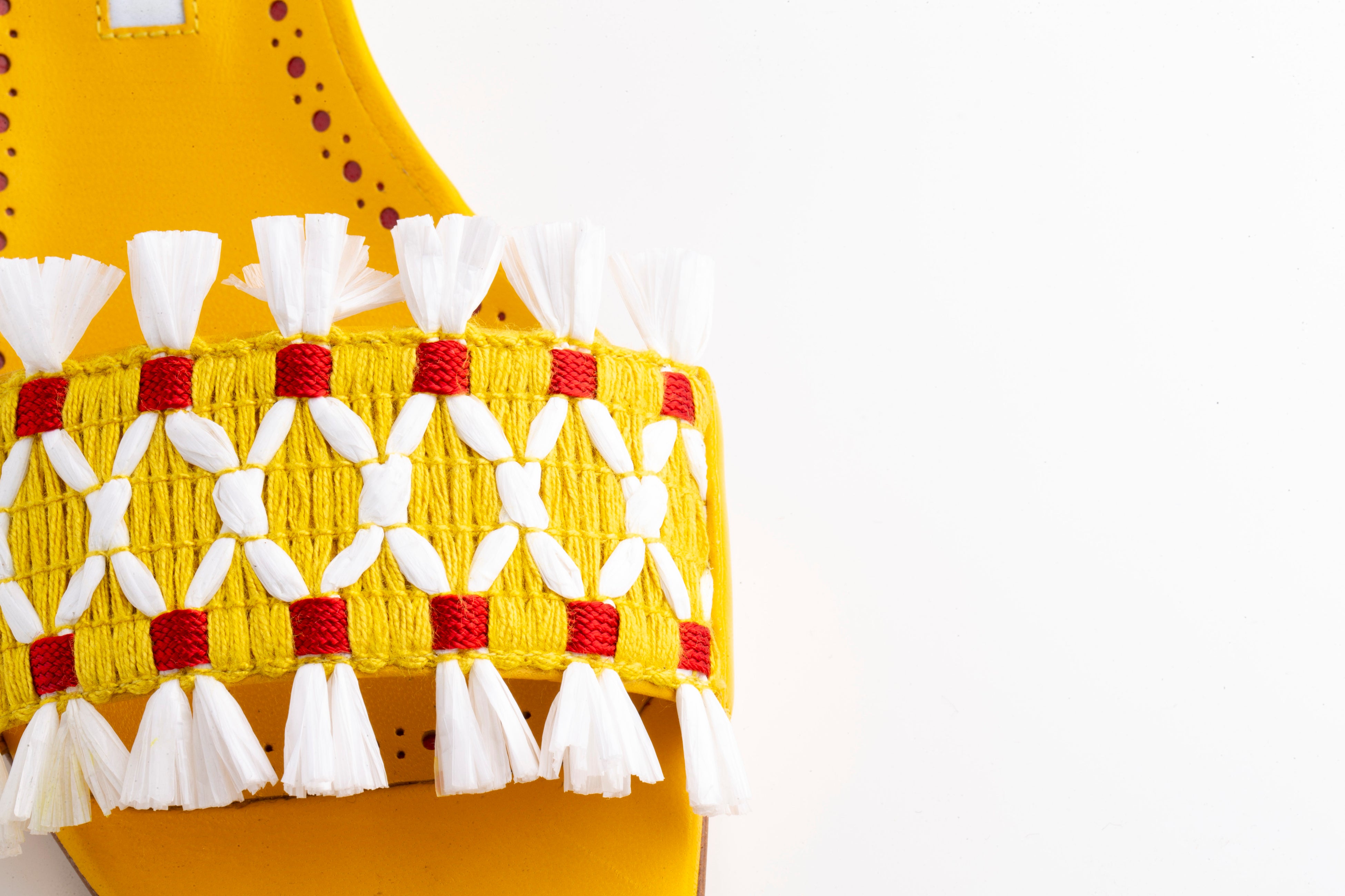 アンデスの雄大な風景とペルーの卓越した職人技が大きなインスピレーション源となっています。自然・素材・装飾の調和を讃えたスタイルは、歴史的な美のエッセンスをマノロ ブラニクらしい視点で再解釈。精密な織りのテクスチャーや繊細なディテールは、熟練のクラフツマンシップへのオマージュとして表現され、ジグザグのラフィアなど手仕事のぬくもりを感じさせるグラフィックな表現が、軽やかな動きとモダンな印象を添えています。