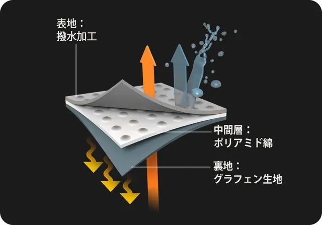 内側の背部にはグラフェン生地を使用しています。グラフェン生地は熱伝導性が高く、鋼の10倍の熱伝導率を誇り、体の熱をしっかり守ってくれます。