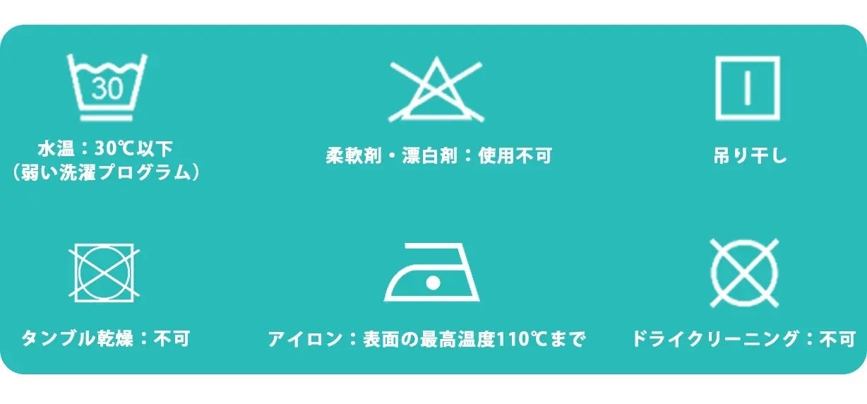 中性洗剤を使用し、柔軟剤、漂白剤は使用しないで下さい。濃い色と薄い色の衣類は分けて洗い、浸け置きや直射日光での乾燥は避けて下さい。印刷部分には直接アイロンをかけないようにして下さい。