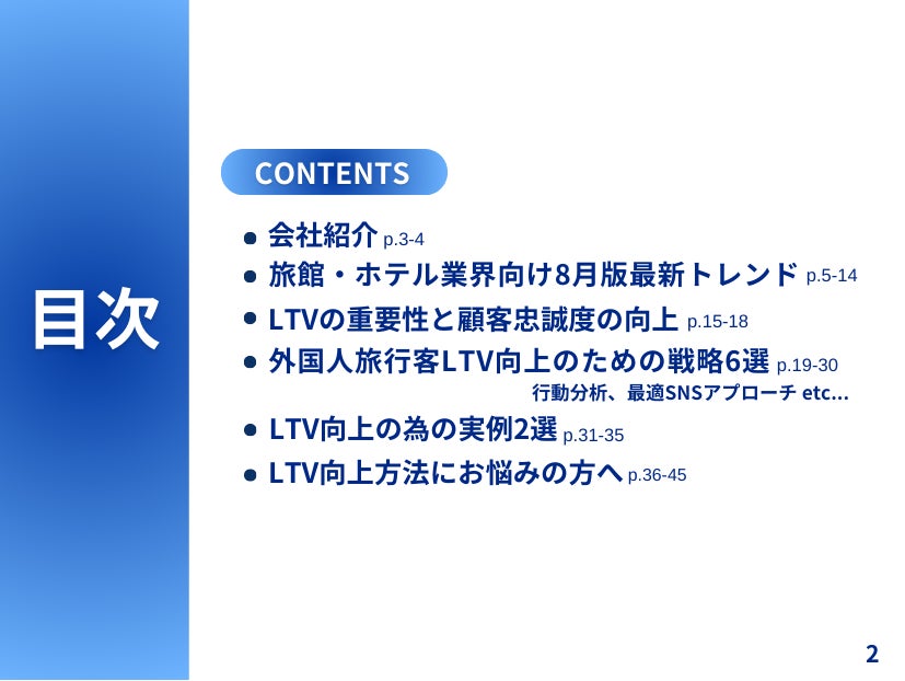株式会社ベクトル(本社:東京都港区、代表取締役会長兼社長:西江 肇司、東証プライム:6058)の子会社であるOwned株式会社(東京都品川区、代表取締役社長、石井翔、以下「当社」)は、「旅館・ホテル業界向け|外国人旅行客のLTV最大化戦略をまとめた最新トレンド・事例紹介レポート」2024年8月版(全45ページ)を無料公開いたしました。