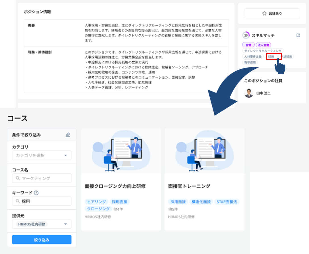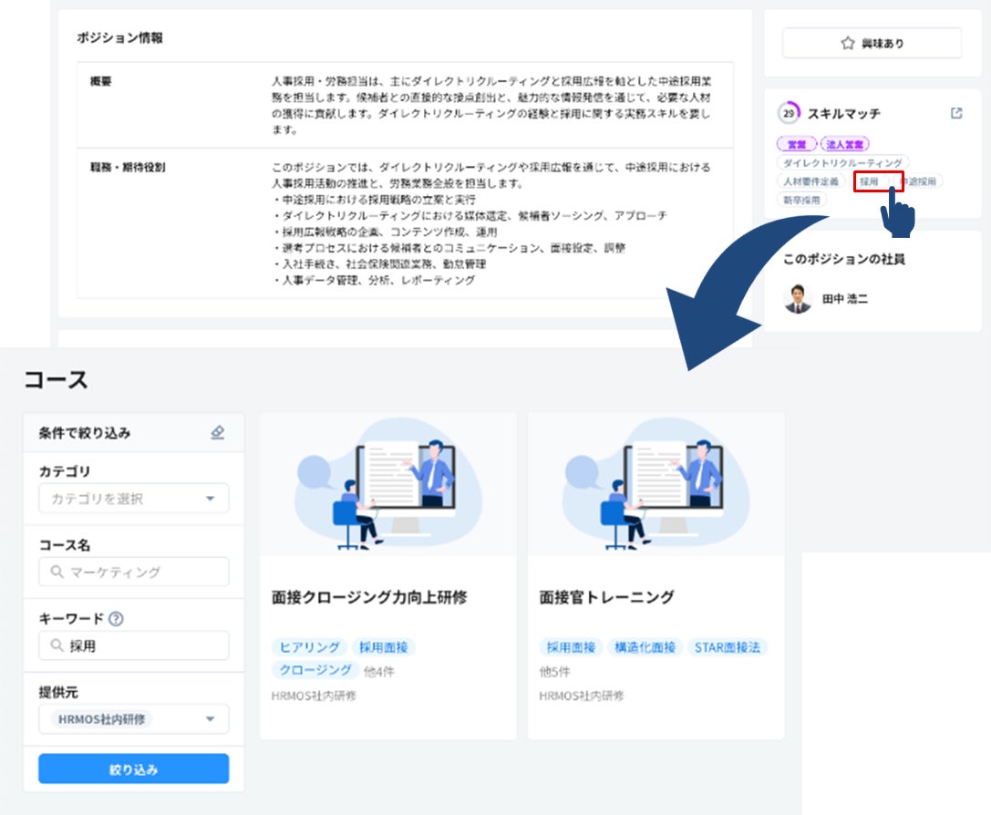 これにより、社員が身につけたいスキルタグをクリックするだけで、HRMOSラーニング上の最適な学習コンテンツが表示され、一人一人にマッチした学びを提案します。