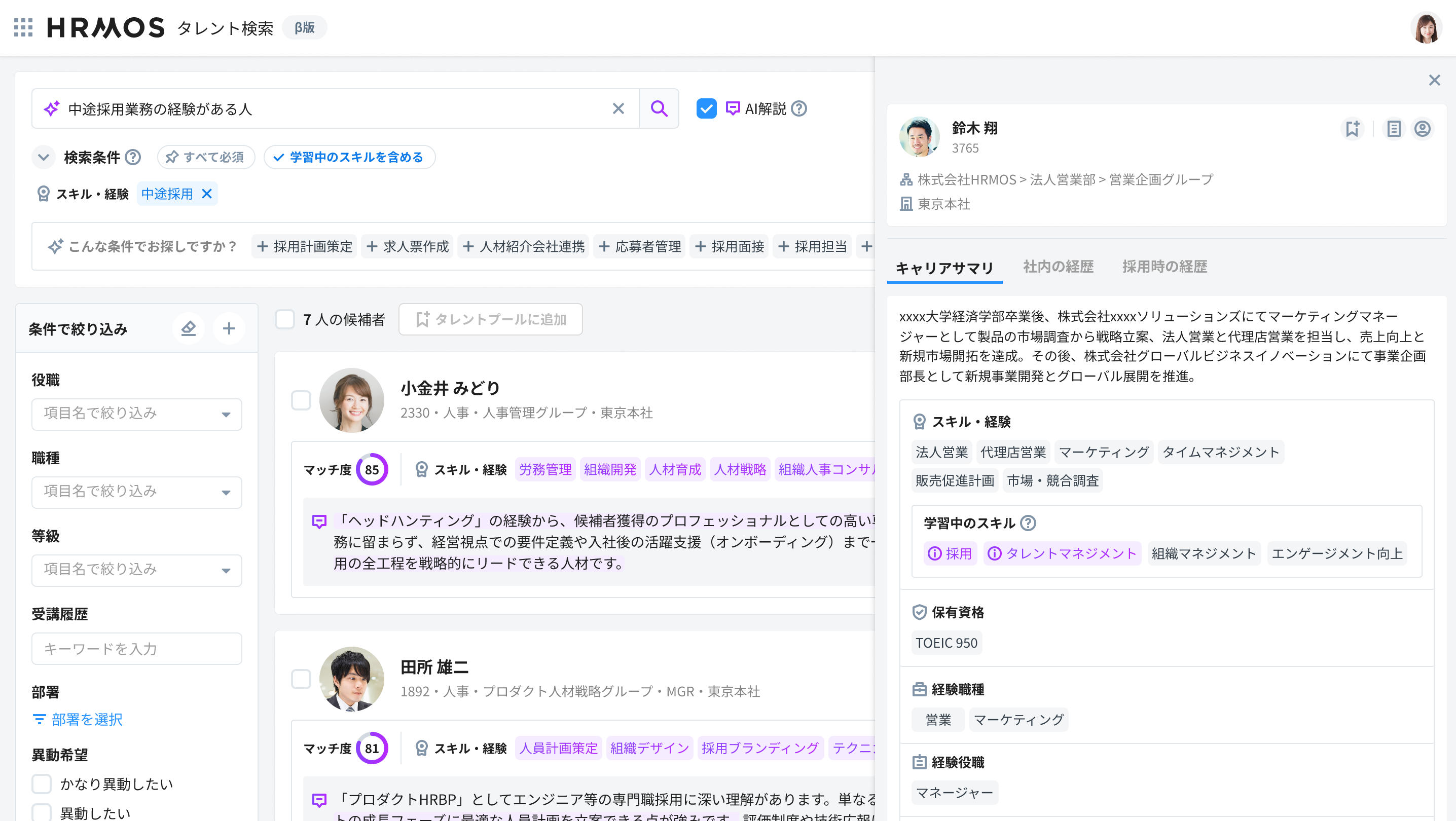 学習履歴データが社内レジュメに反映されることで、社員の学習意欲を抜てき・異動に活用することが可能になります。例えば、社内版ビズリーチのタレント検索機能で、検索条件にHRMOSラーニングで学習済みのスキルを含めることで、候補者の幅を広げ、個人の成長意欲に応じたキャリア選択の機会を提供します。