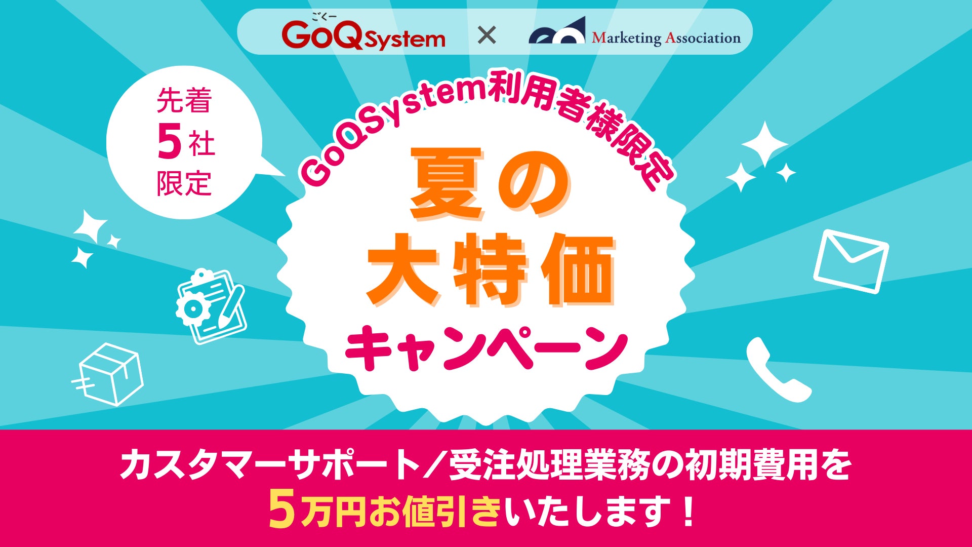 EC業界向けカスタマーサポート代行サービスを提供しているマーケティングアソシエーション株式会社(本社:東京都台東区 代表取締役:中園広和、以下当社)は、株式会社GoQSystem(本社:東京都中央区、代表:藤本 卓治)と連携し、夏の大特価キャンペーンを開催します。