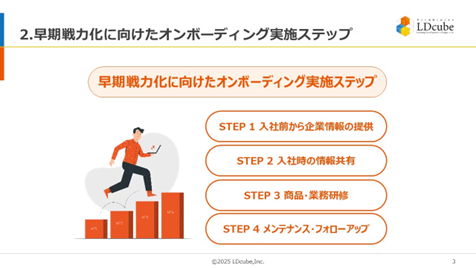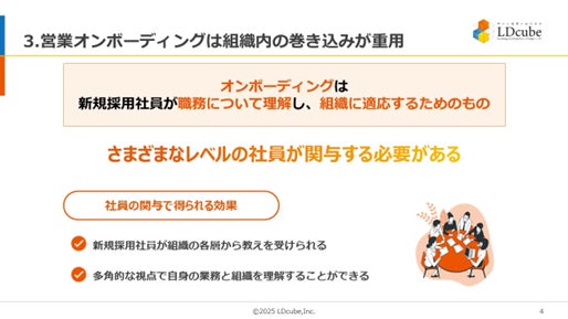 ・営業メンバーへの初期教育で重要なオンボーディングの役割について理解する ・営業の早期戦力化に必要な考え方と指標を紹介する |