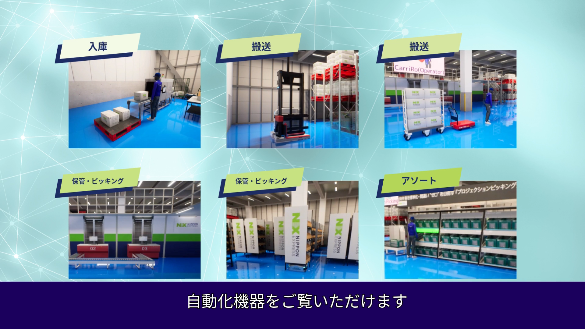 「デジタルショールーム」は、お客様がオンライン上でNXグループの物流拠点やサービスを体験できる場です。施設の規模感やオペレーションの流れ、自動化機器の動作を、実際に現場を歩いているかのような感覚で、直感的に理解していただくことを目的としています。