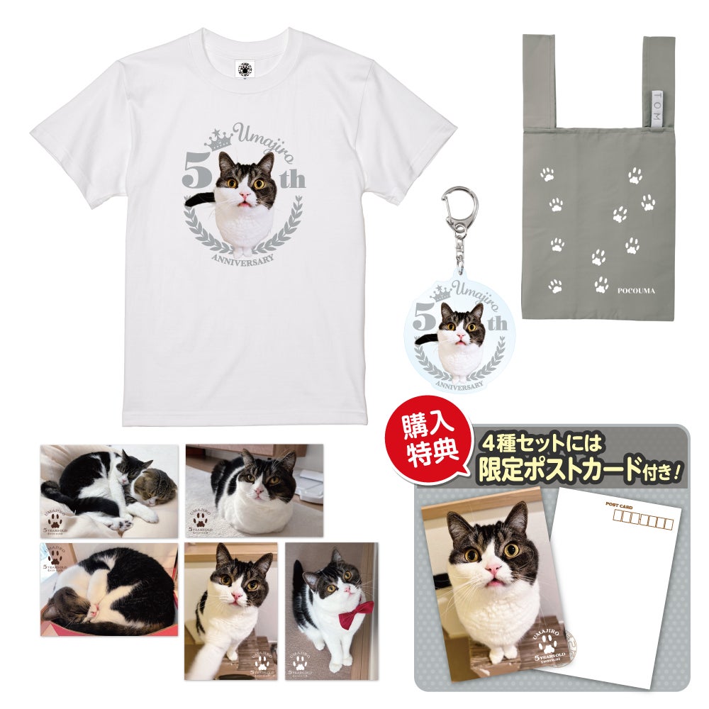 うま次郎5歳記念デザインのアクリルキーホルダー、Tシャツ(ホワイト)、うま次郎4歳の思い出ポストカード5枚セット、今回限定グッズとなるぽこうま1/1サイズの肉球がプリントされたデイリーバッグ、の4点セット商品です。