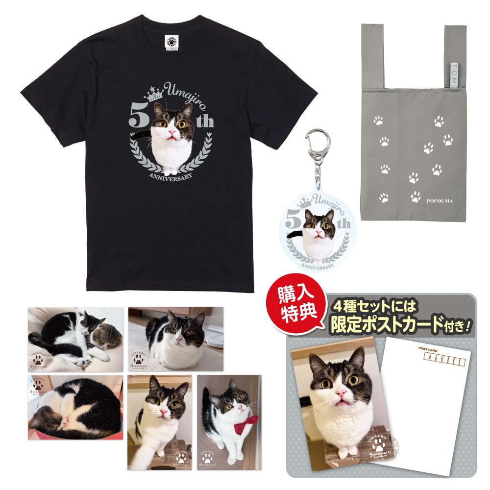 うま次郎5歳記念デザインのアクリルキーホルダー、Tシャツ(ブラック)、うま次郎4歳の思い出ポストカード5枚セット、今回限定グッズとなるぽこうま1/1サイズの肉球がプリントされたデイリーバッグ、の4点セット商品です。