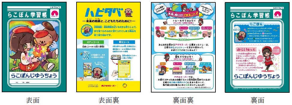 『小さな挑戦!大きな未来♪』・『未来の地球のために!今できることを♪』をテーマに様々な活動をしているアオキスーパーの公式キャラクター『らこぽん』(らっこ)と『あおきみらい』ちゃんを学習帳のデザインに採用し、親しみやすく楽しく学べる教材としました。