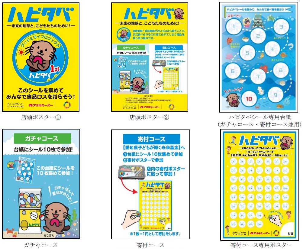 店頭のポスターに『ハピタベシール』を貼っていただくか、専用台紙にシールを10枚貼って寄付箱へ投函すると、1枚につき1円を≪愛知県子どもが輝く未来基金≫へ寄付いたします。