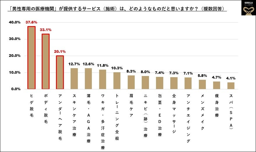 アンケート調査結果では、《男性が考える「男性向けの医療機関」が提供するサービス(施術)》に、5位の「薄毛・AGA治療(12.6%)」、10位「包茎・ED治療(7.4%)」を上まわり、【①ヒゲ脱毛(37.6%)②ボディ脱毛(33.1%)③アンダーヘア脱毛(20.1%)】と「脱毛」がトップ3を独占。
