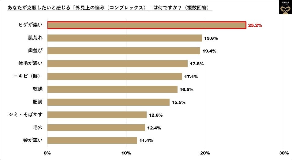 - 【克服したい外見の悩みは?】最多に「ヒゲが濃い(25.2%)」、次点に「肌荒れ(19.6%)」「歯並び(19.4%)」と続く