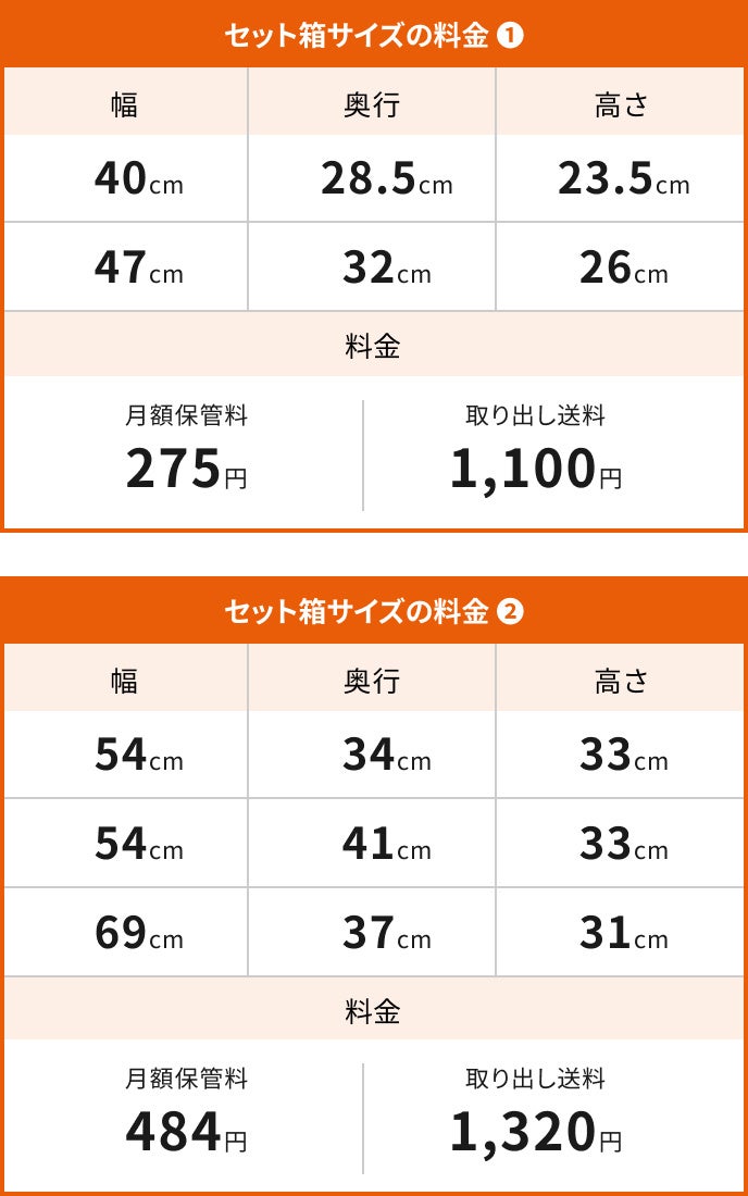 ※セット箱サイズ3辺の合計が90cm〜115cmのダンボールで、最大6ヶ月間保管料が無料となります(275円×6ヶ月=1,650円)