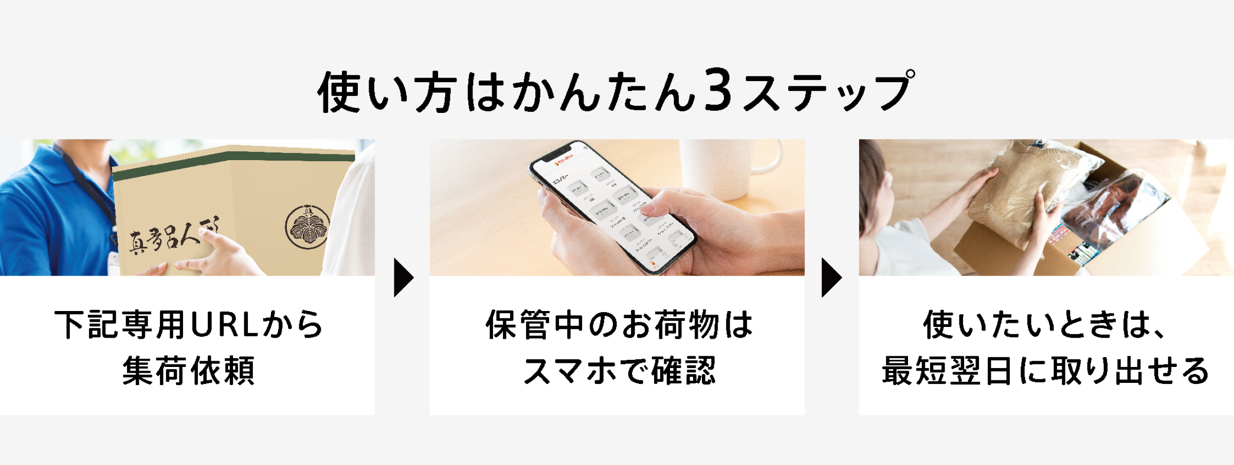 この度の真多呂人形との業務提携では、購入時の真多呂人形のダンボールで雛人形をそのままサマリーポケットに預けることができます。スマホ一つで必要なときに雛人形を取り出し・預け入れできることで、ご自宅の収納スペースを有効活用することが可能となります。