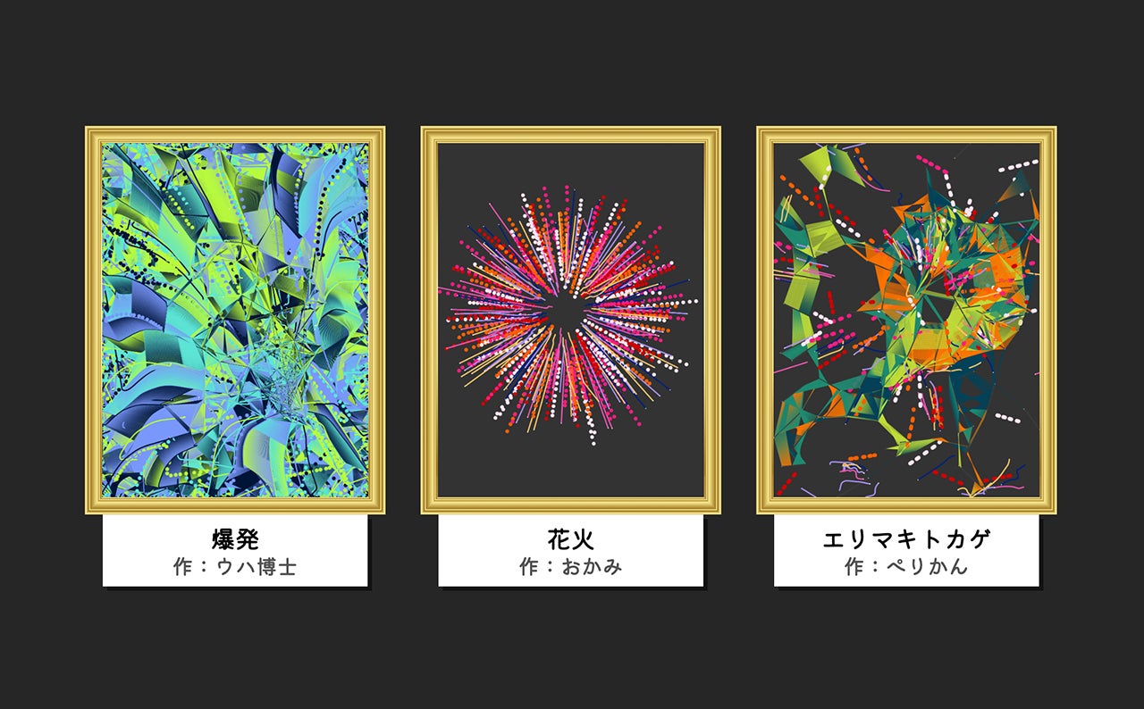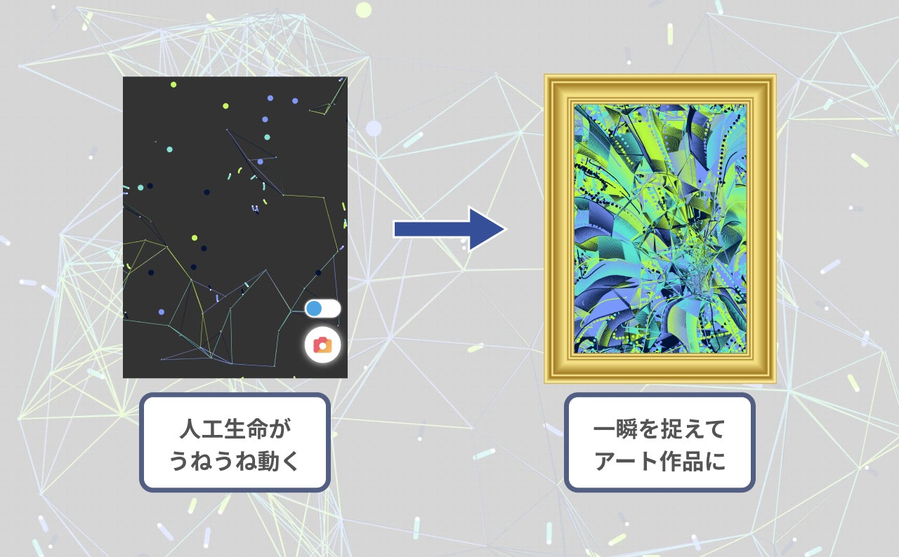 人工生命のアルゴリズムで動くカラフルな擬似生物たちが、アーティスティックな模様を作り出します。