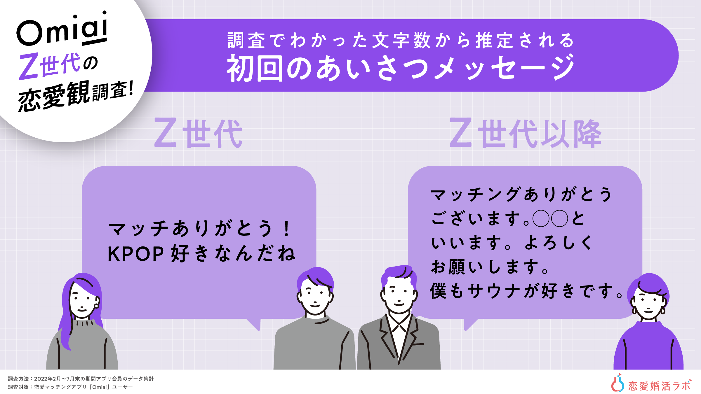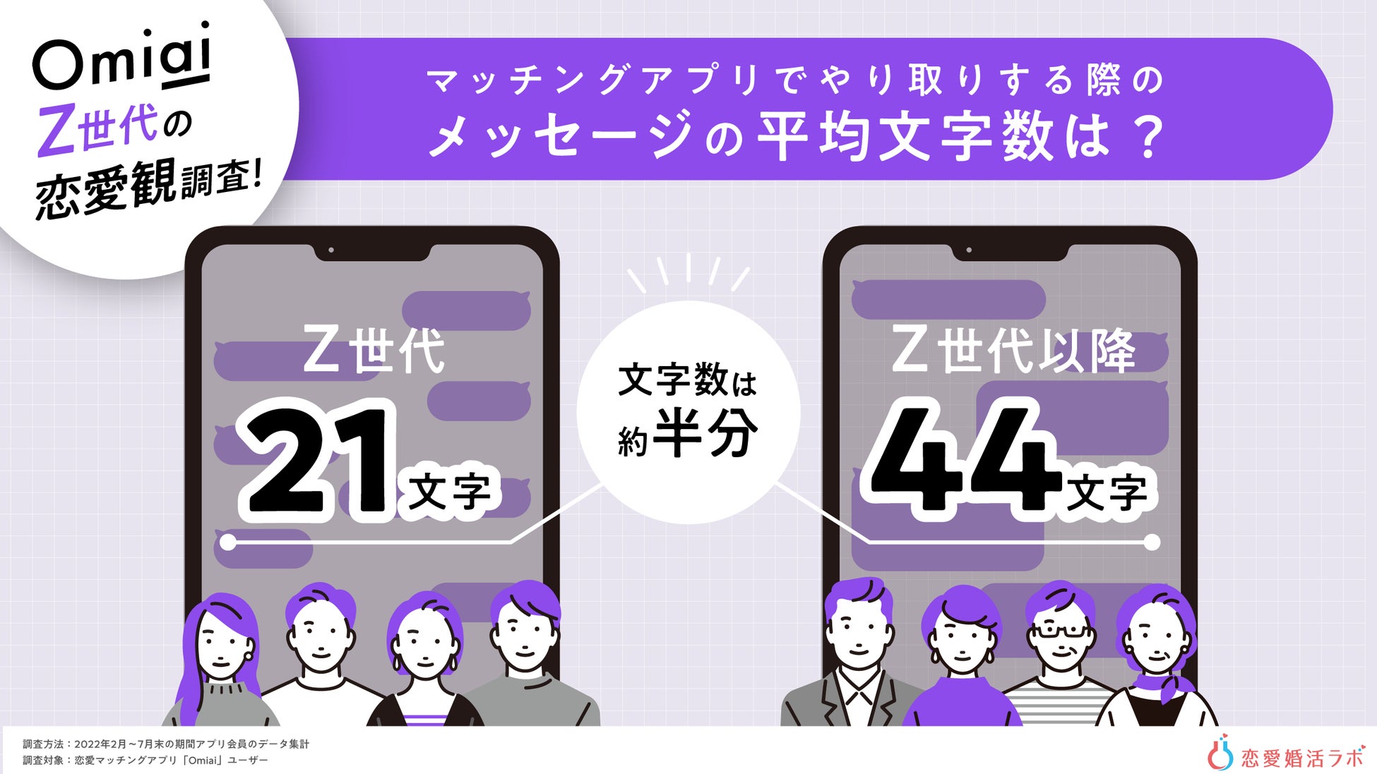 恋愛マッチングアプリ「Omiai」を利用するユーザーの、マッチングアプリ内のメッセージ1通あたりの文字量を調査したところ、男女ともにZ世代はZ世代以降の半分の文字量でメッセージをしていることがわかりました。
