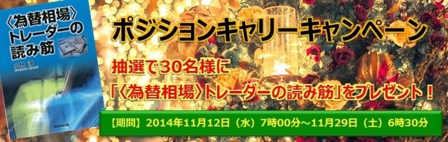 当社では2014年11月12日(水)7時00分時点より2014年11月29日(土)6時30分時点の建玉数が10万通貨以上増えたお客様で、お申込み頂いたお客様の中から抽選で30名様に「〈為替相場〉トレーダーの読み筋」をプレゼントさせて頂くキャンペーンを実施いたしました。