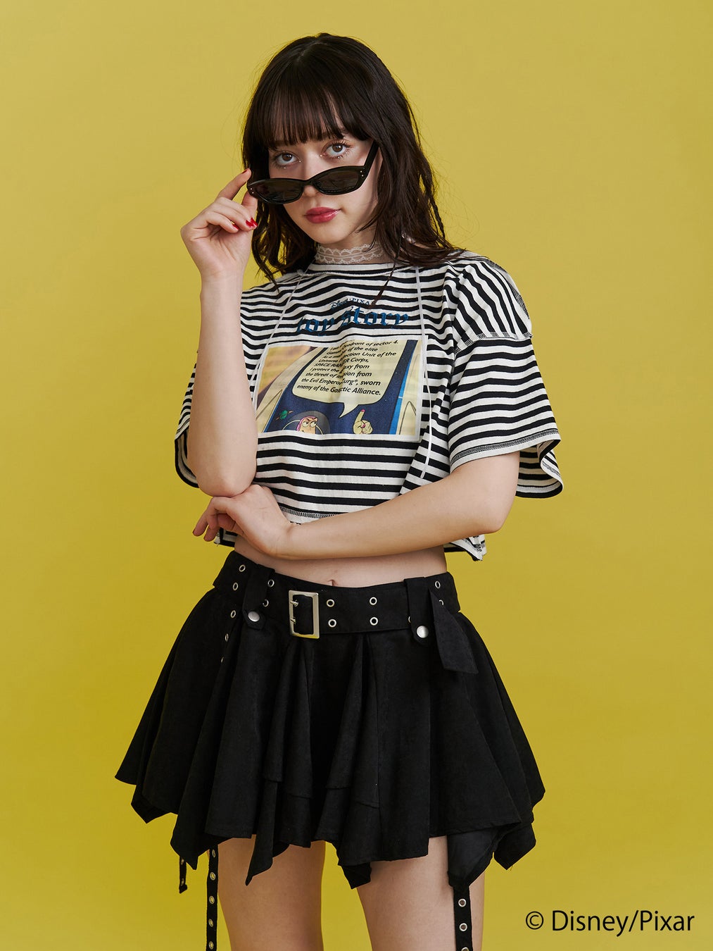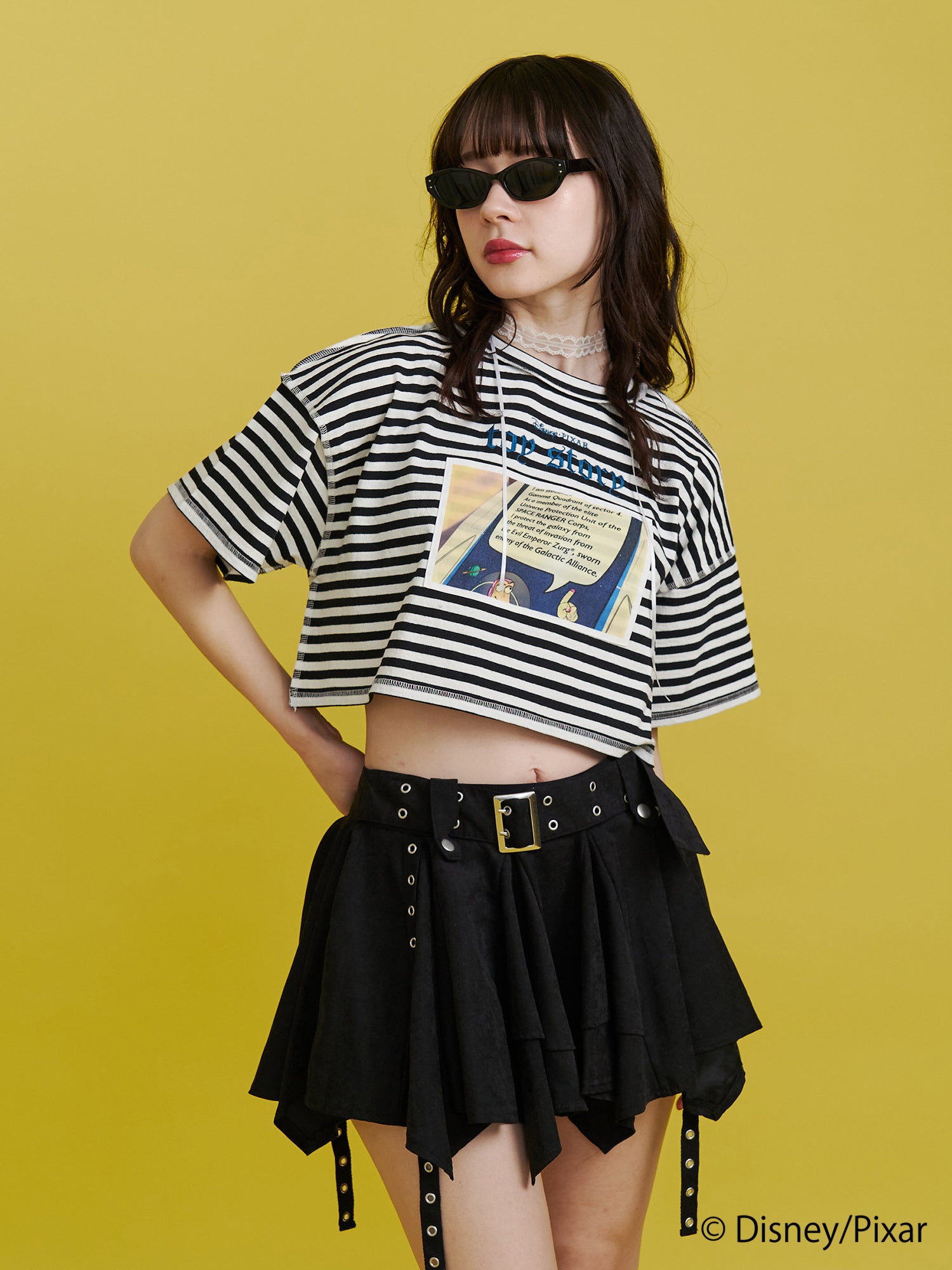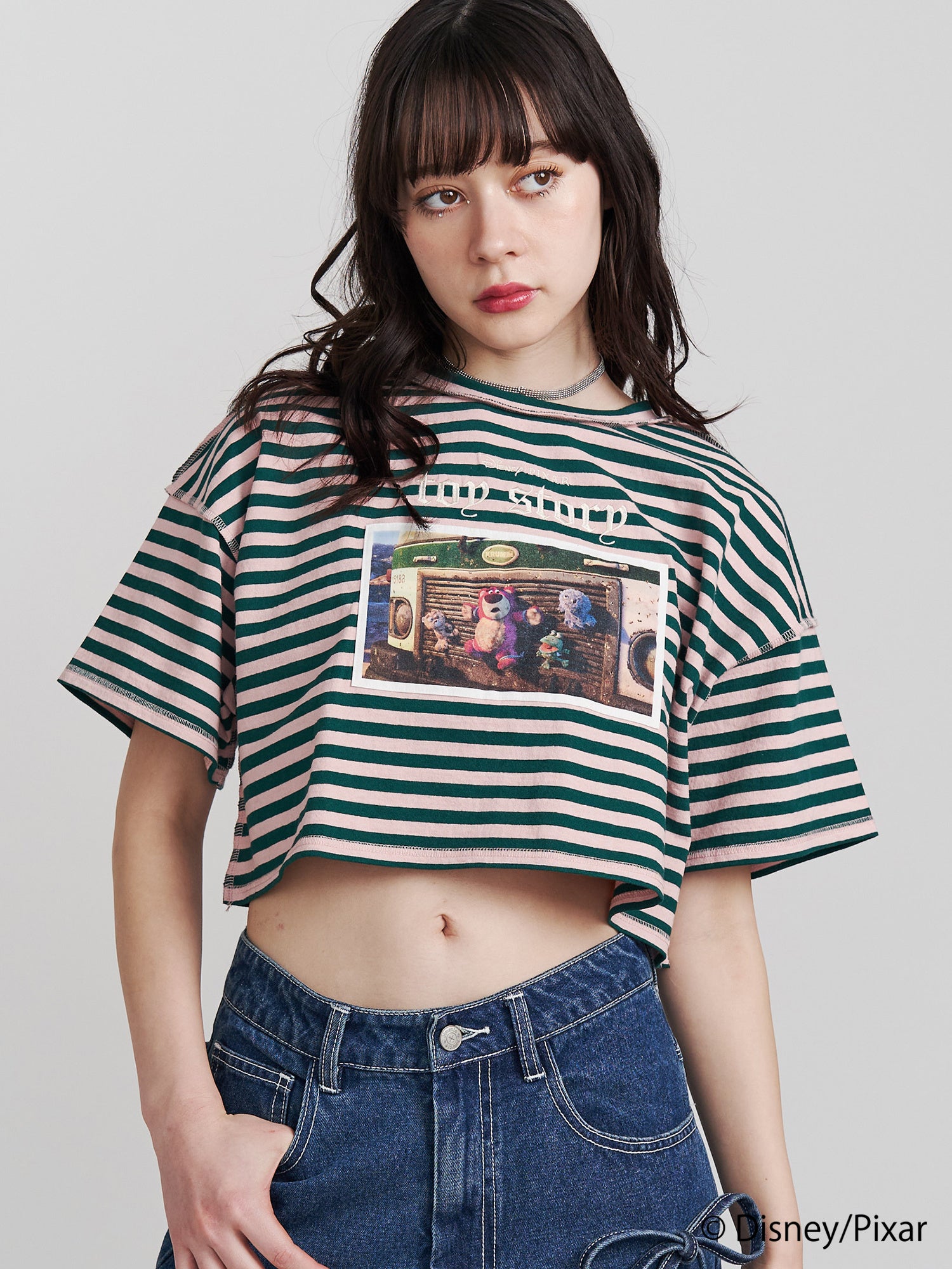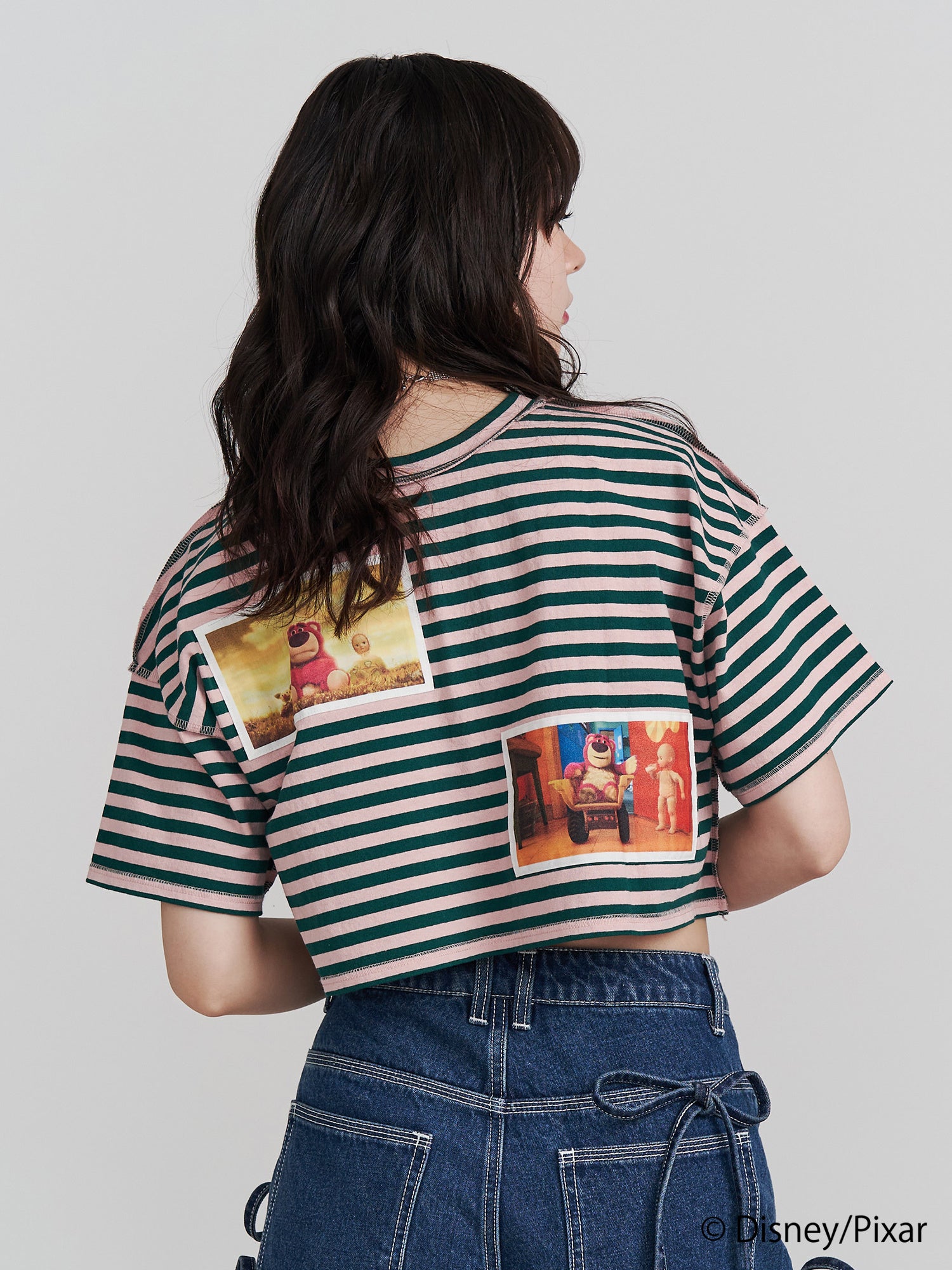 アニメシーンを切り抜き、縫い付けたクロップド丈のTシャツは配色ロックステッチと『TOY STORY』のロゴ刺繍がアクセントのアイテムです。アイボリーは「バズ・ライトイヤー」、ピンクは「ロッツォ」のアニメシーンをメインに前後2WAY仕様で着こなしの幅が広がるTシャツです。