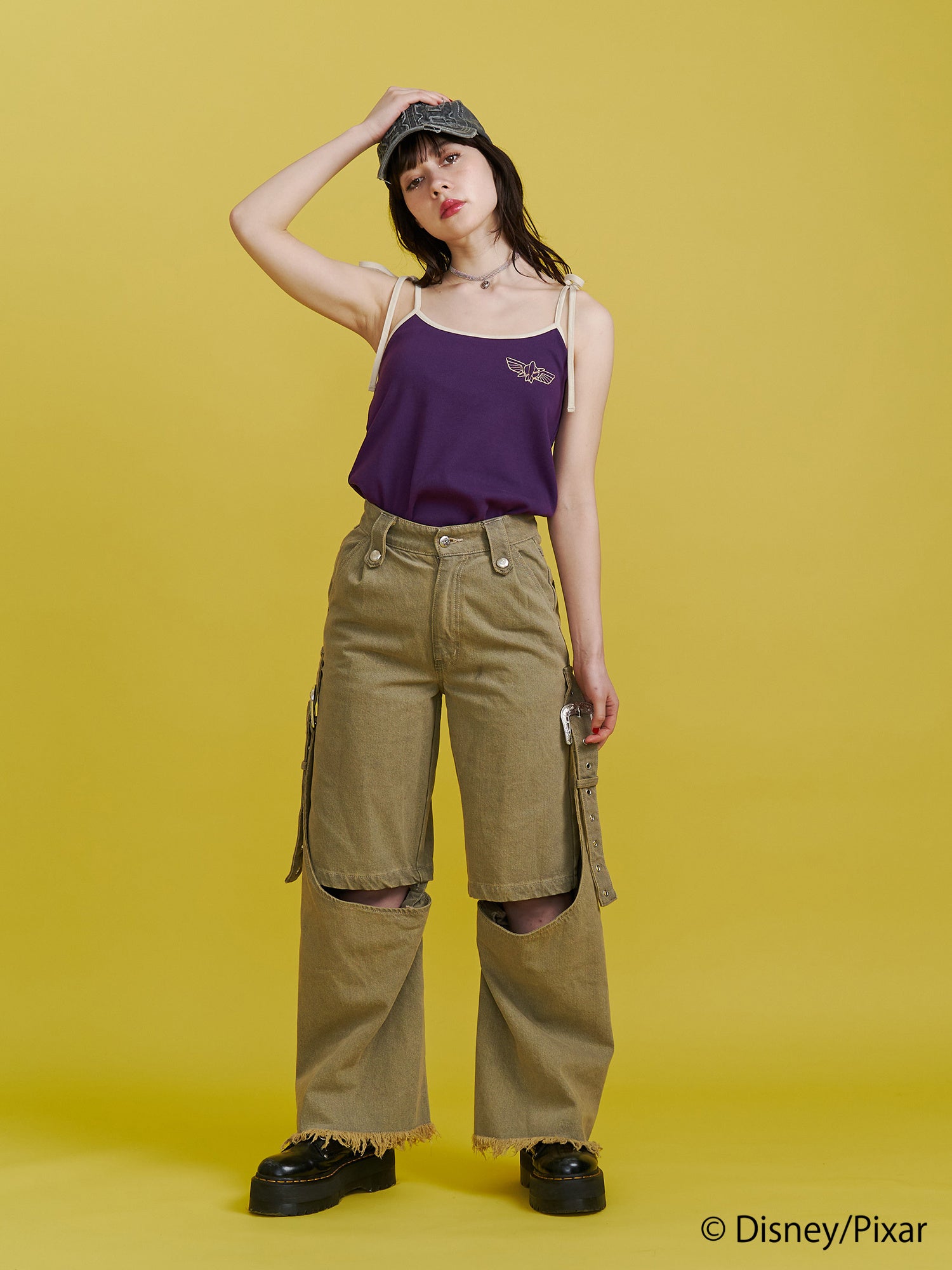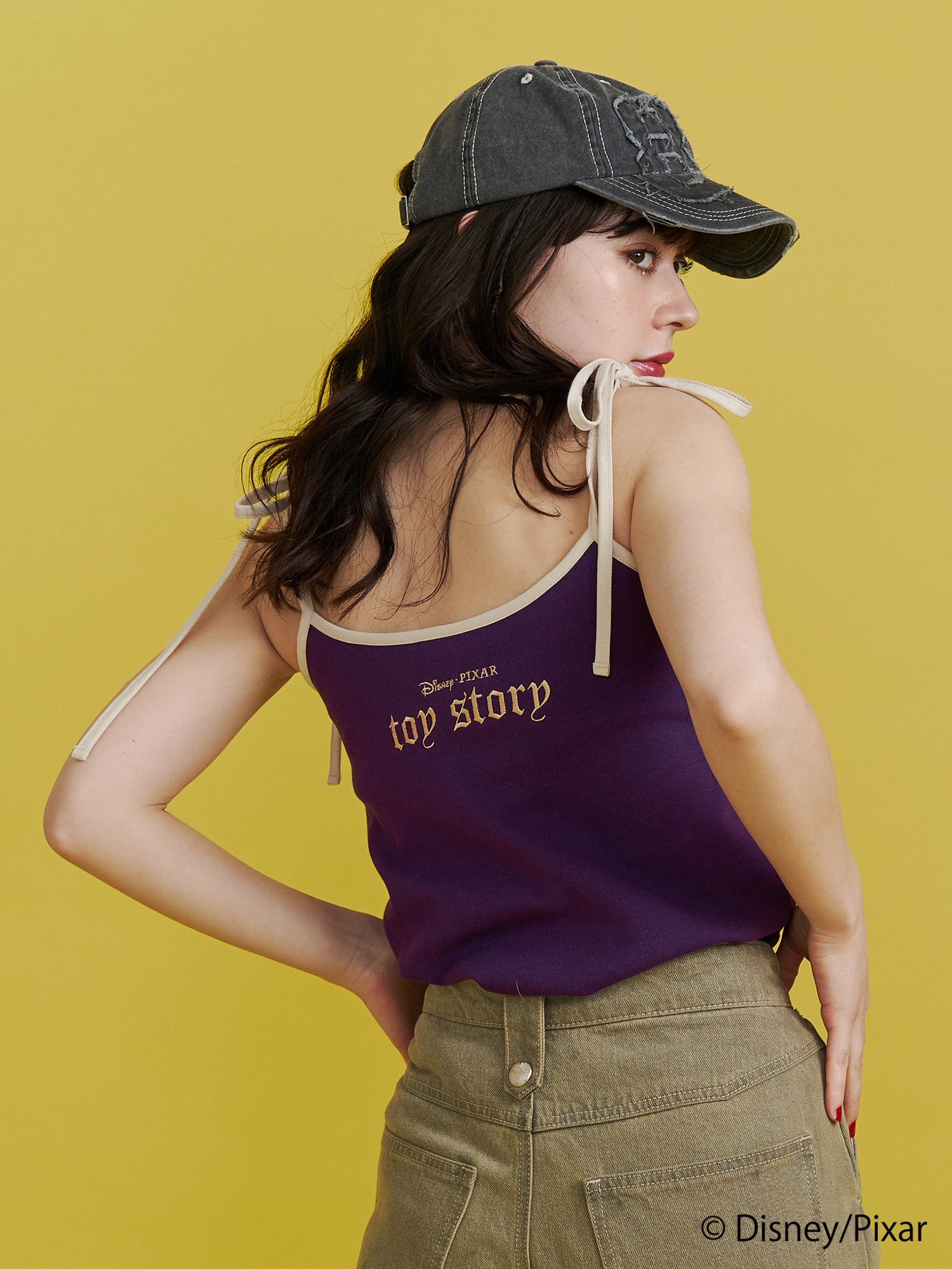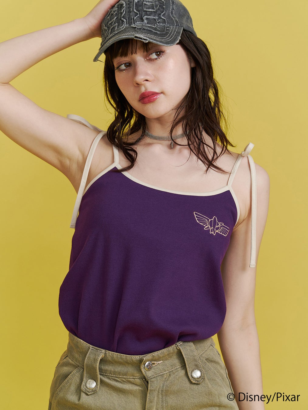 インナーパット付きのキャミワンピースは、グリーンには「エイリアン」のアート、パープルには「バズ・ライトイヤー」のアートを胸元に刺繍しました。肩紐リボンやバックスタイルの『TOY STORY』のロゴ刺繍もポイントです。