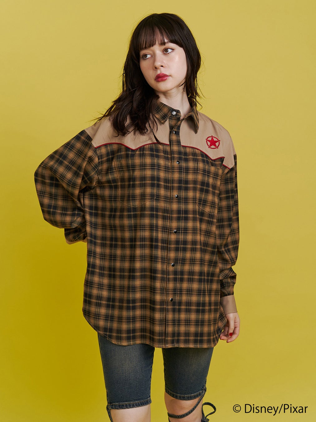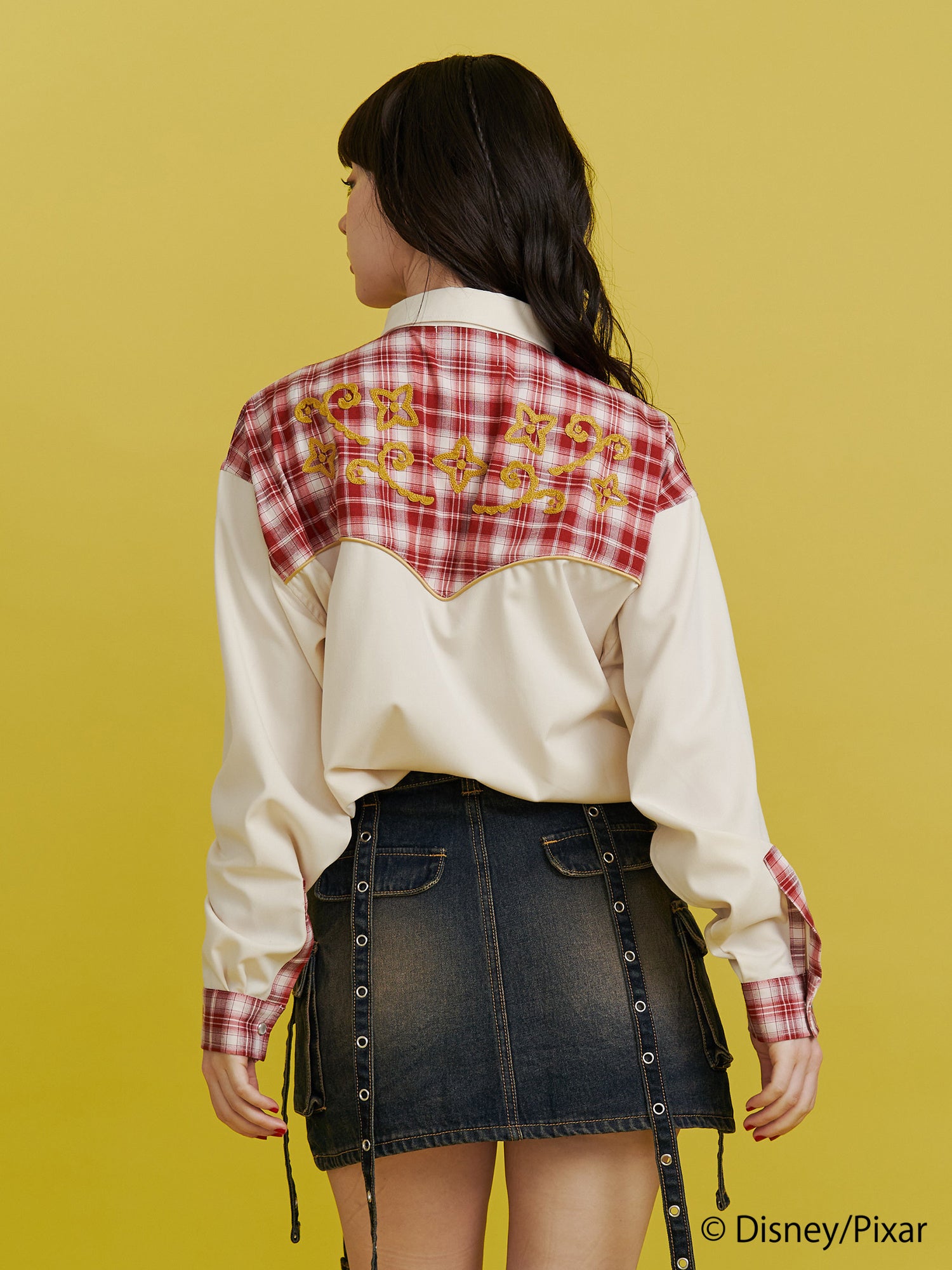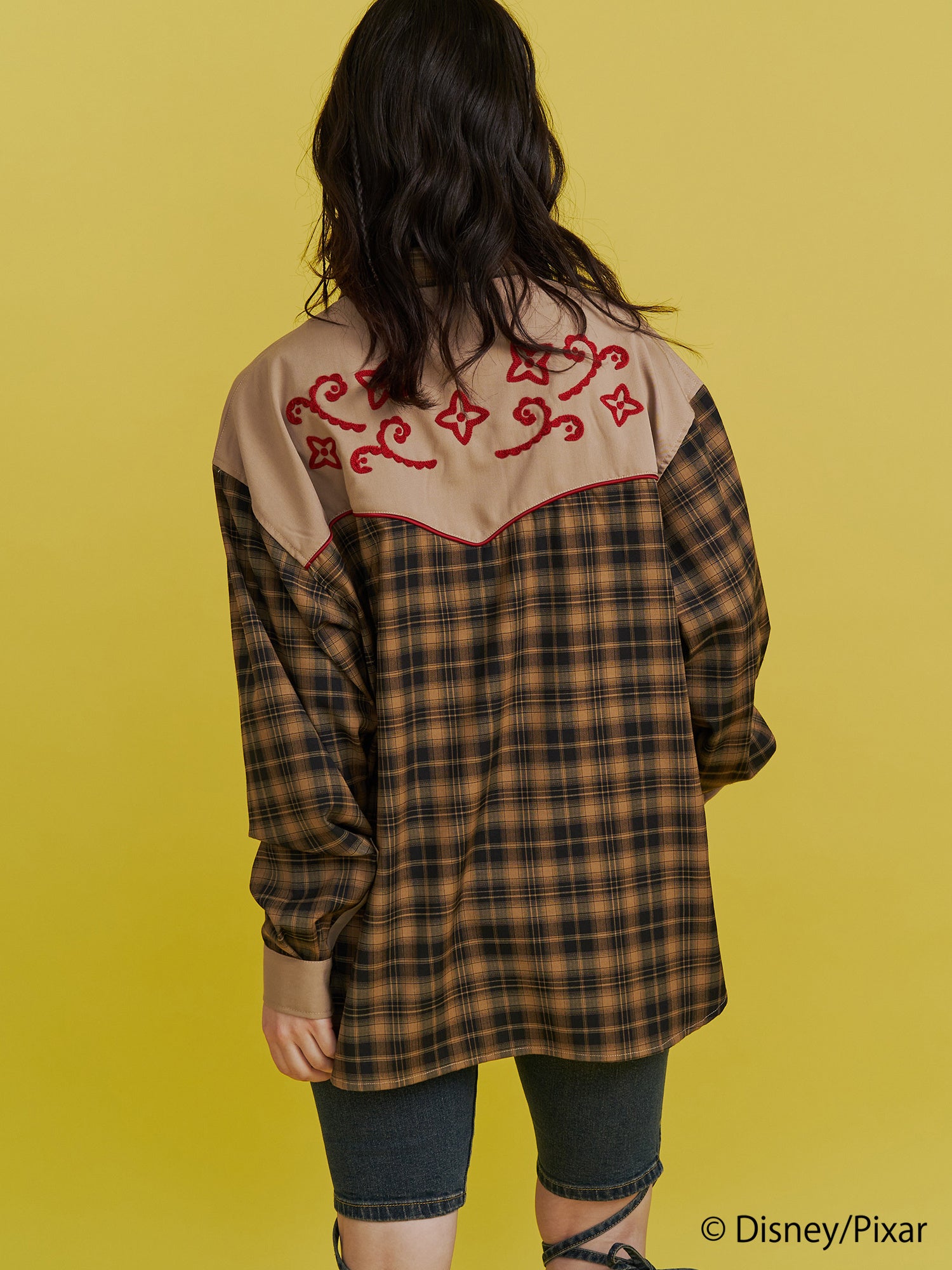 リメイク風チェック切り替えやサテンパイピングでこだわったシャツは、アイボリーには「ジェシー」のベルトバックルのアート、ブラウンには「ウッディ」の保安官バッジのアートを胸元に刺繍しました。バックスタイルはウエスタン調のアートをチェーン刺繍で施しました。