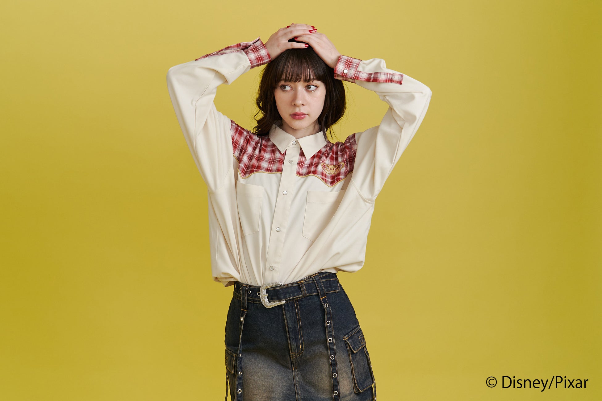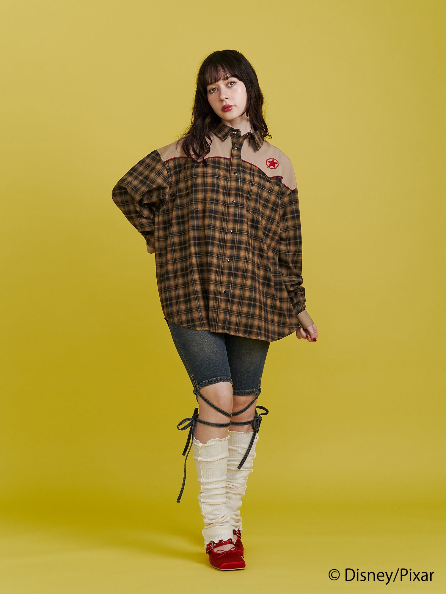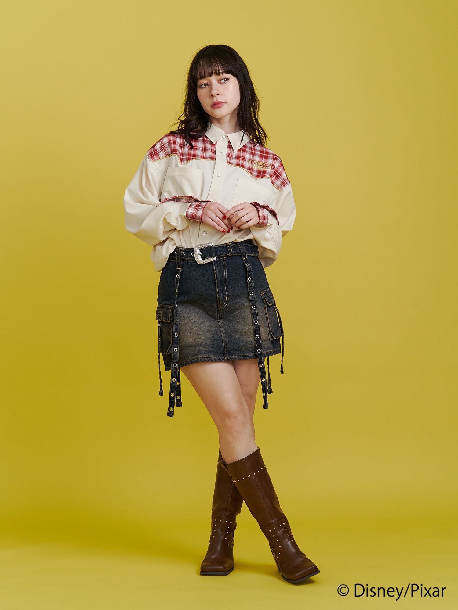 リメイク風チェック切り替えやサテンパイピングでこだわったシャツは、アイボリーには「ジェシー」のベルトバックルのアート、ブラウンには「ウッディ」の保安官バッジのアートを胸元に刺繍しました。バックスタイルはウエスタン調のアートをチェーン刺繍で施しました。