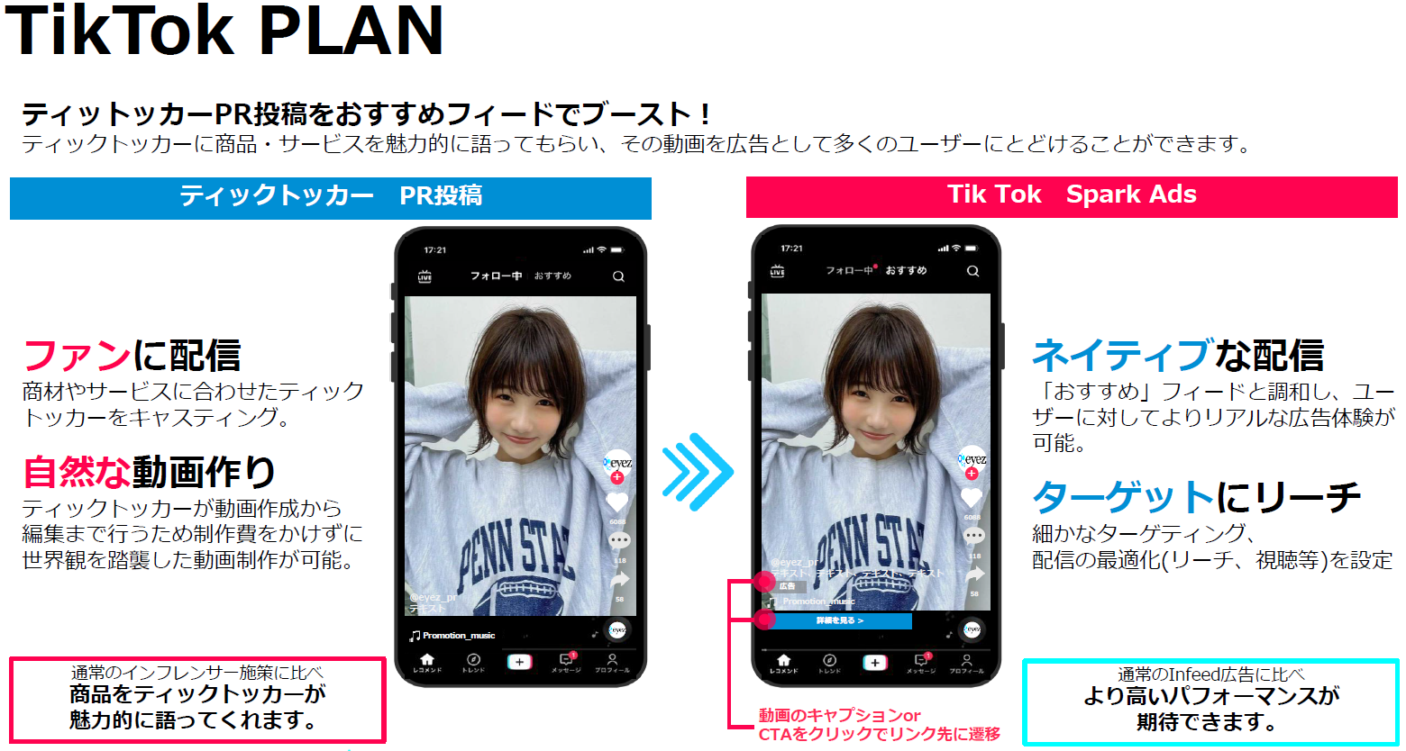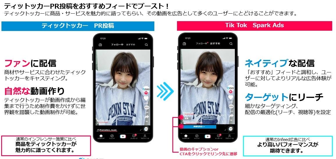 ティックトッカーが投稿した動画(PR動画)を広告へ活用するため、広告色無く自然な形で消費者へ情報が届けられます。