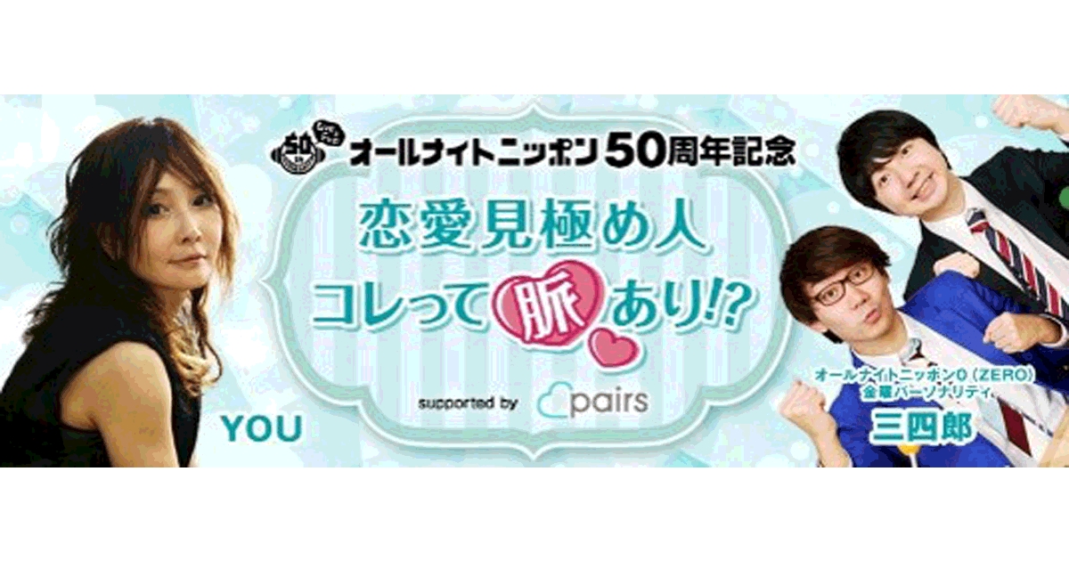 株式会社エウレカ(本社:東京都港区、代表取締役CEO:石橋準也)が運営する恋愛・婚活マッチングサービス『Pairs(ペアーズ)』(https://www.pairs.lv/ )は、2018年4月30日(月)深夜2時10分頃より、ニッポン放送「オールナイトニッポン」とのコラボレーション企画「恋愛見極め人!コレって脈あり!?」を開始いたします。