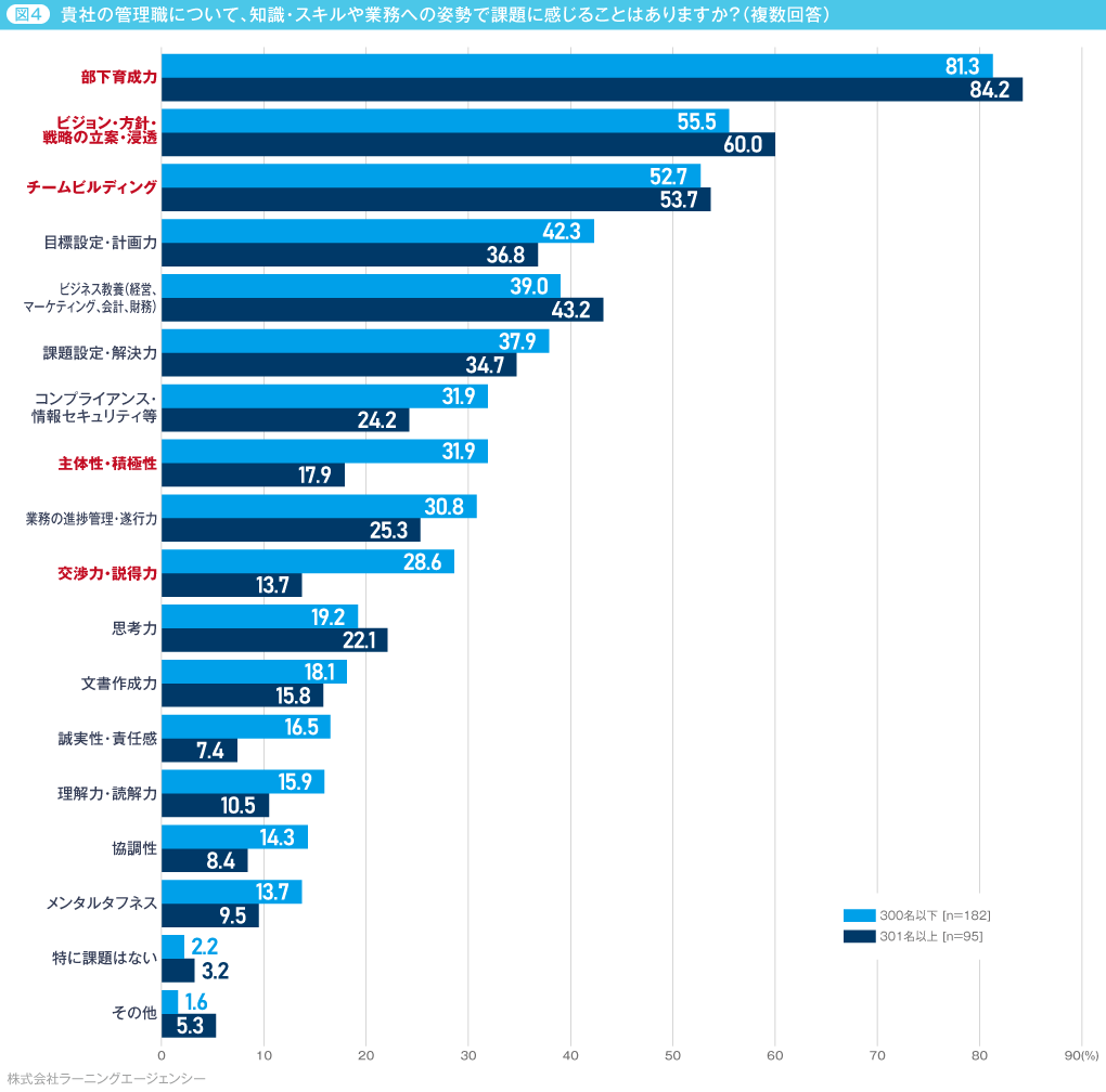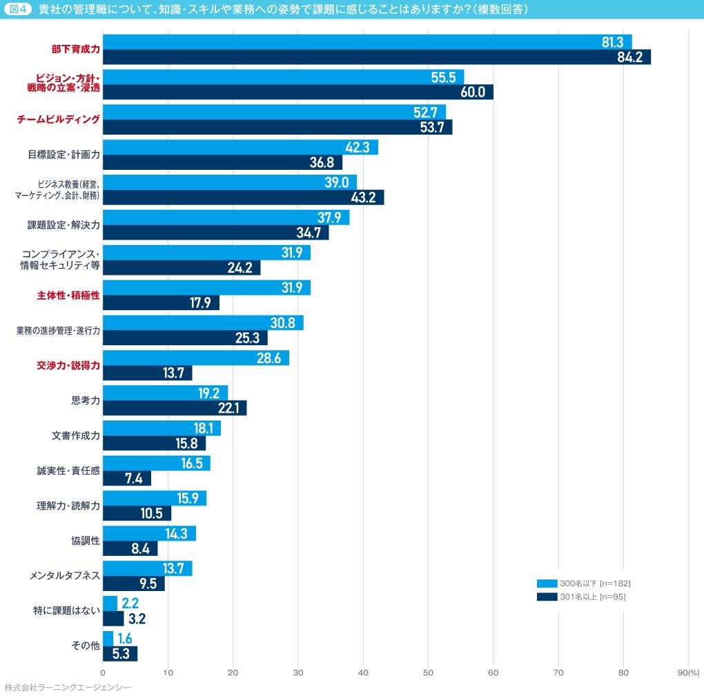 新入社員、若手社員の課題においては、301名以上の結果の数値が300名以下を上回ることが多く、より課題感がある結果となりましたが、管理職に関しては逆の結果となり、300名以下が上回る項目が多くなりました。特に、「交渉力・説得力」は300名以下が14.9ポイント高く、「主体性・積極性」は14ポイント高い結果でした。(図4)